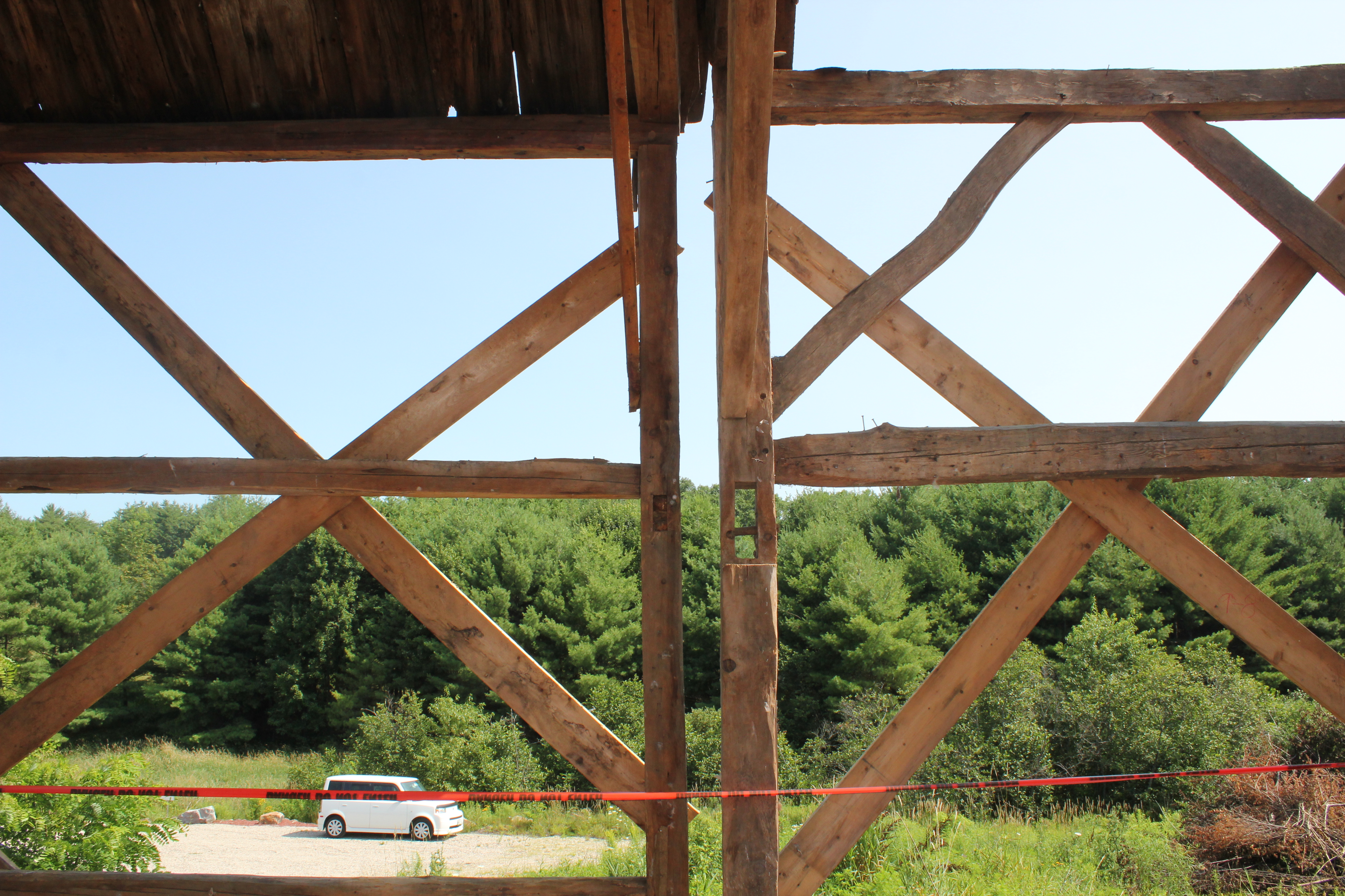 I write a lot about our unusual jobs: a deserted island, an elevated dance floor, or a building-sized jewelry box, but most of us got into this to do jobs like the Jennison barn. The job incorporates so many of PTF’s defining motifs: barn preservation, adaptive re-use, local history and creative clients. The Jennisons called in early 2015 about a barn that had collapsed under extreme snow loads. After assessing the damage to the frame, and a long period of negotiation with the insurance company, we concluded that the barn was not salvageable, and that its replacement would need to be significantly scaled down. Ultimately, too many of the posts had snapped in the collapse, and the replacement coverage did not include the embodied value of the craftmanship and timber joinery. Fortunately, PTF had dismantled a smaller frame the previous year, and had hoped we could find it a home nearby.