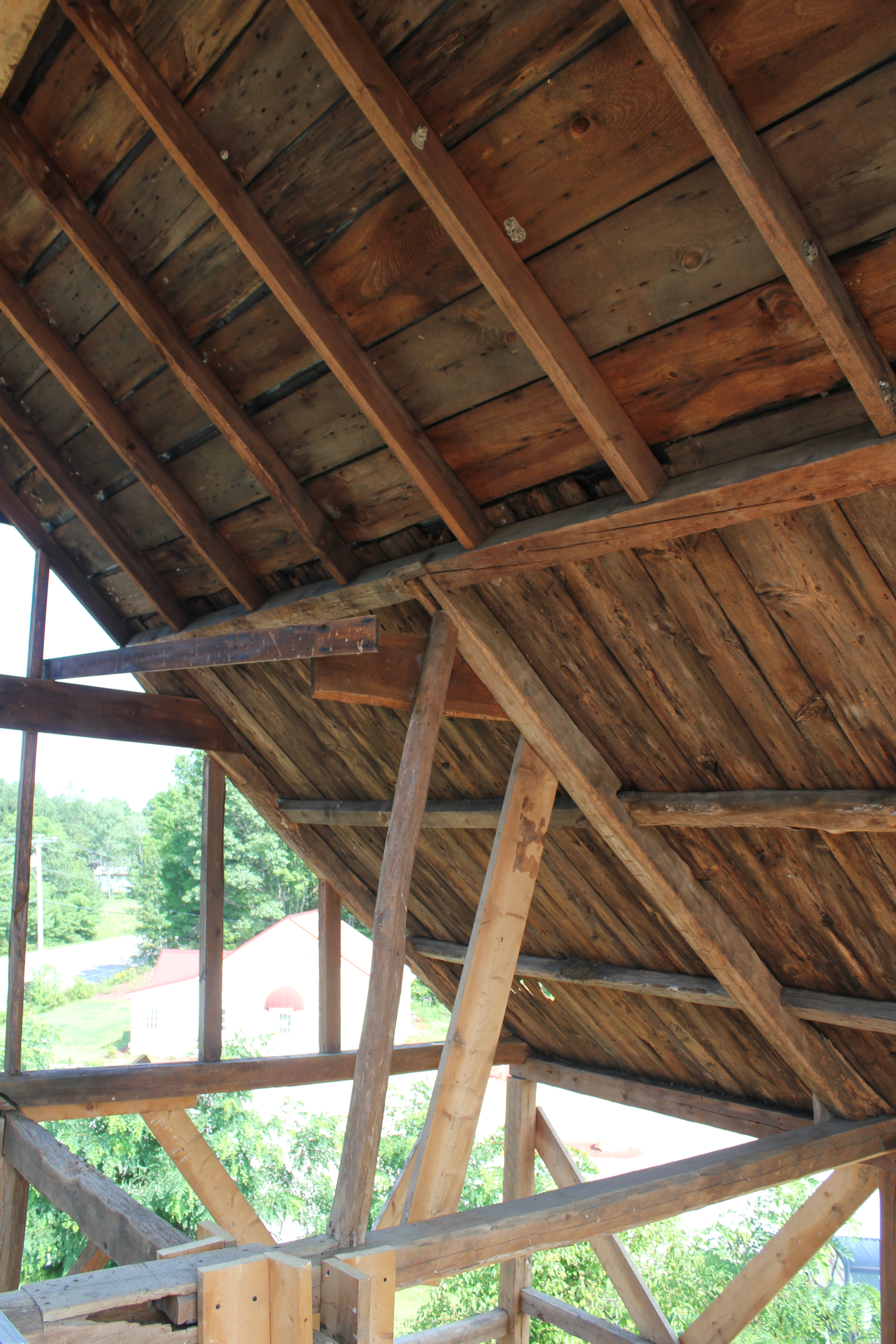Both frames have hewn timbers and scribed joints. Both frames exhibit the English tying joint, where the plate crosses over the post, parallel with the eave, and the tie beam crosses over the top of the plate. The interior face of the post, about half its thickness, extends past the plate to join to the tie beam with a teasel tenon. Both frames are eave entry, which was an earlier, “English”, floor plan. Both frames are early enough that it is difficult to date them definitively. The larger frame has up and down sawn braces, some of which exhibit the natural curvature of the limb, as above, but this does not date it. The first saw mill to operate on the neighboring falls was established in 1634. The 28′ x 42′ frame is also distinguished by much larger timbers, especially the lower tying girt and longer braces. Based on framing methods alone, it could have been constructed anywhere between 1790 – 1840.