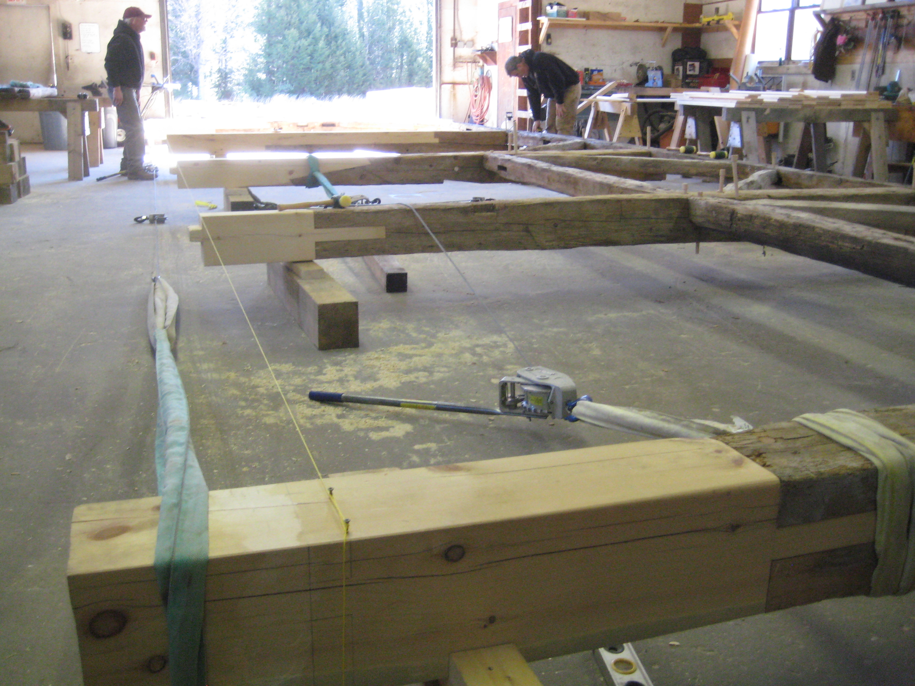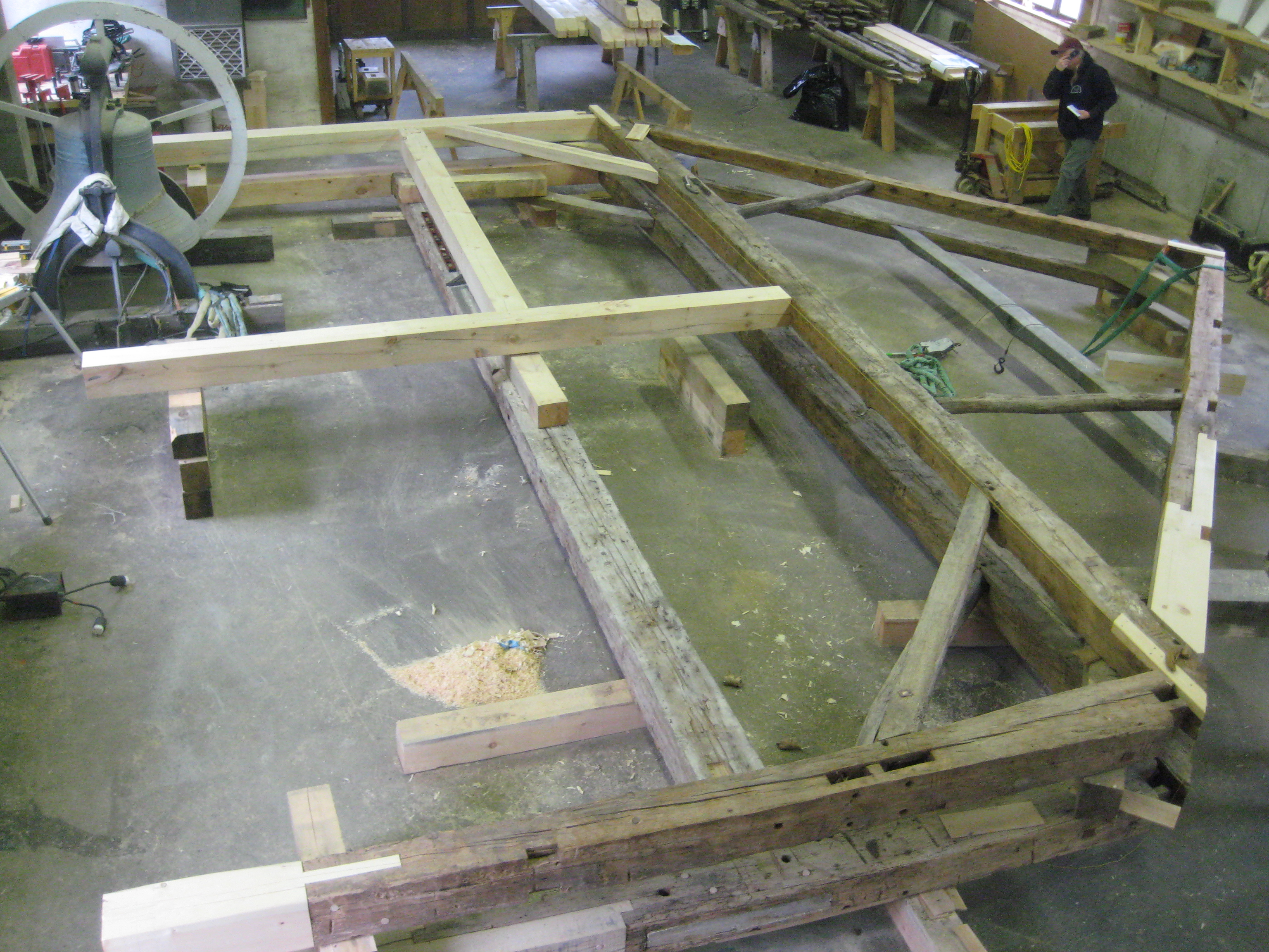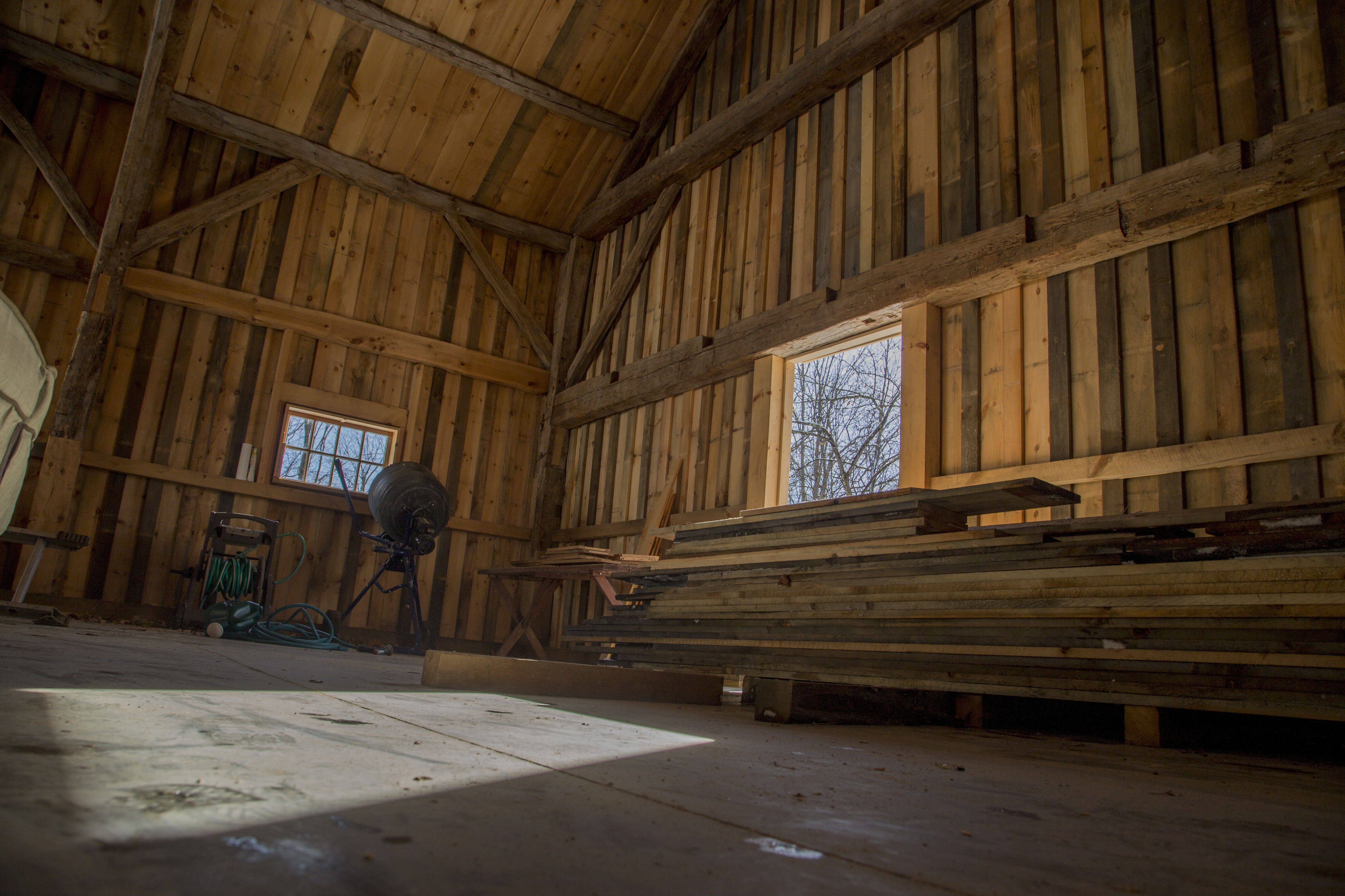 The Jennisons bought the 28′ x 42′ frame. Dave, Tom and Dan performed the frame repairs, and the results are stunning. Standing, the barn is defined by its array of post repairs. Each scarf joint was designed to maximize the preservation of original wood, and withstand the array of forces endured by each post. They planed the new timbers and fared their edges to blend seamlessly with the old.