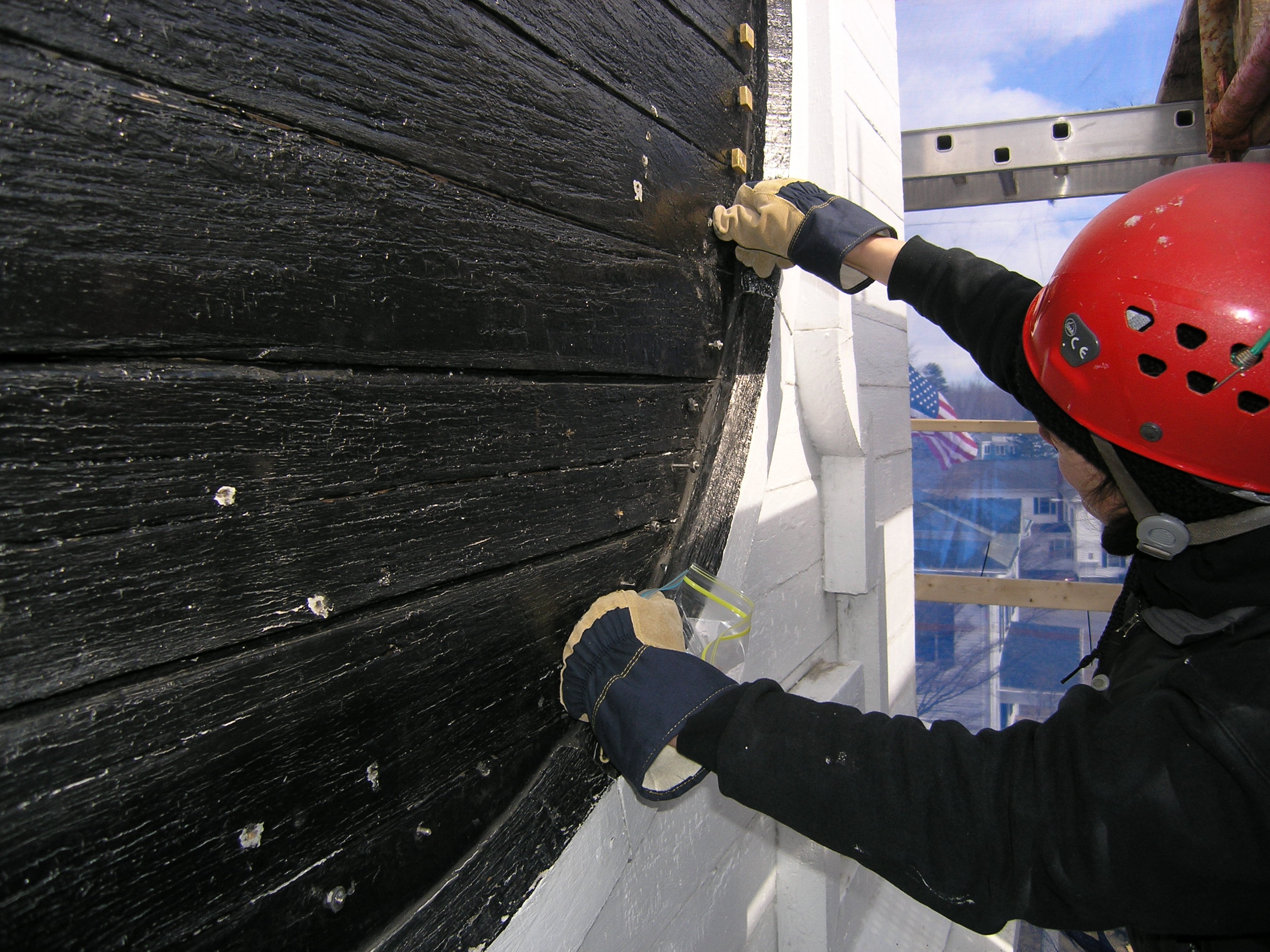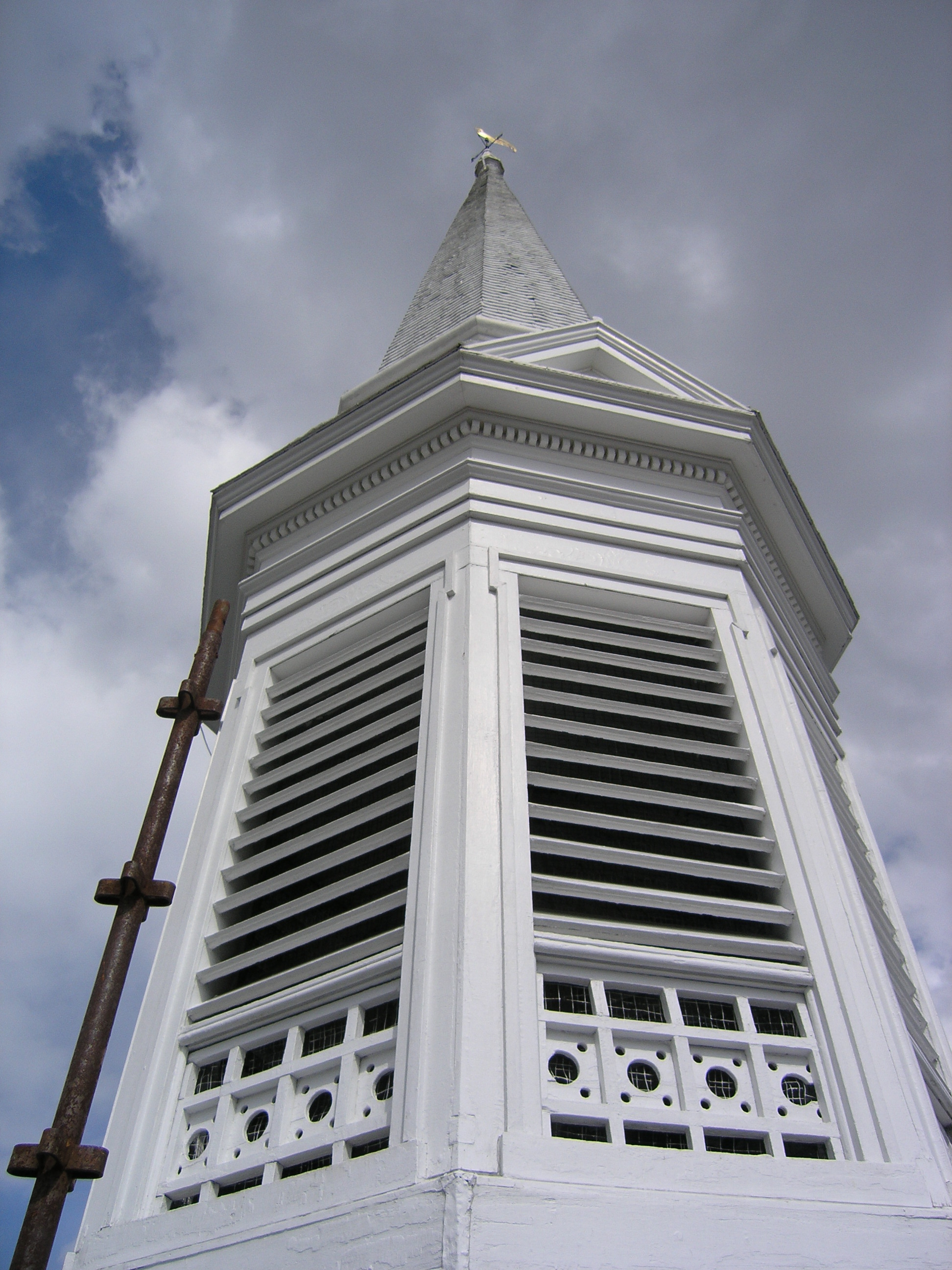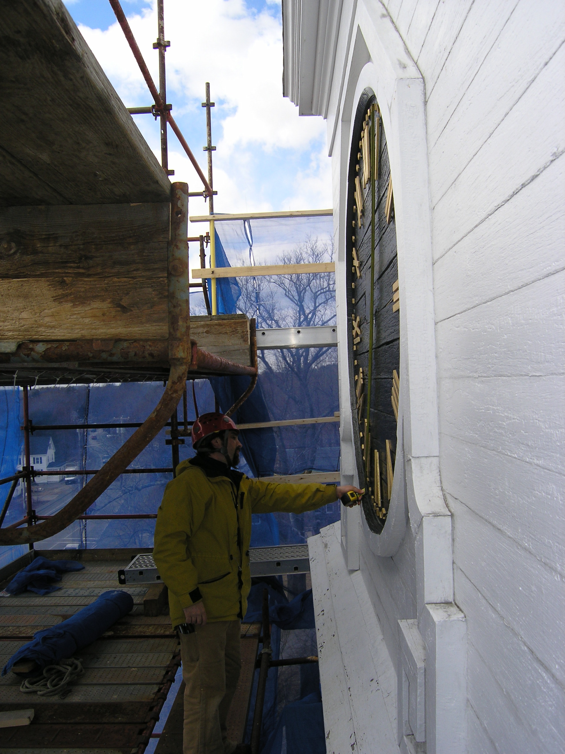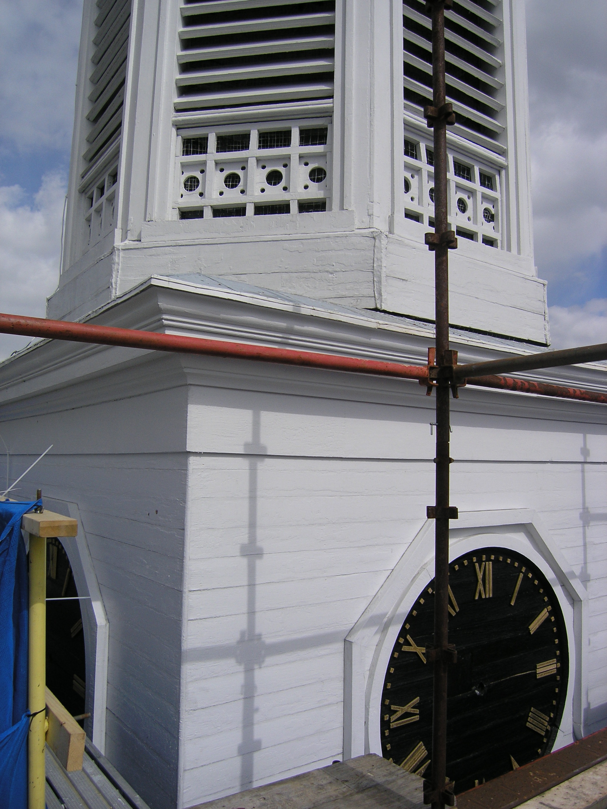 It is time for this old girl to get a face lift. Her frown lines brim with caulk. The clock faces are simply painted on the flush siding and framed with trim applied directly to the surface. Considering the lack of flashing, the trim has held up well, and we suspect that we will be able to restore and reuse approximately 75% of it. The white painted sides are in good shape, but because the faces are painted directly on the siding, we will have to replace the paneling totally. We speculated that the deterioration of the black portion was due to the increased heat absorption and movement of black painted wood, but concluded that the difference in wear was more likely due to better maintenance of the white portion. It is much easier (if you can call painting a steeple easy) to slap white paint on the trim and outer siding, than removing the numbers for painting, and cutting black paint in around the trim. But we can only apply makeup for so long, and at this point, this clock tower’s going under the knife. Click on the photos below for more information.