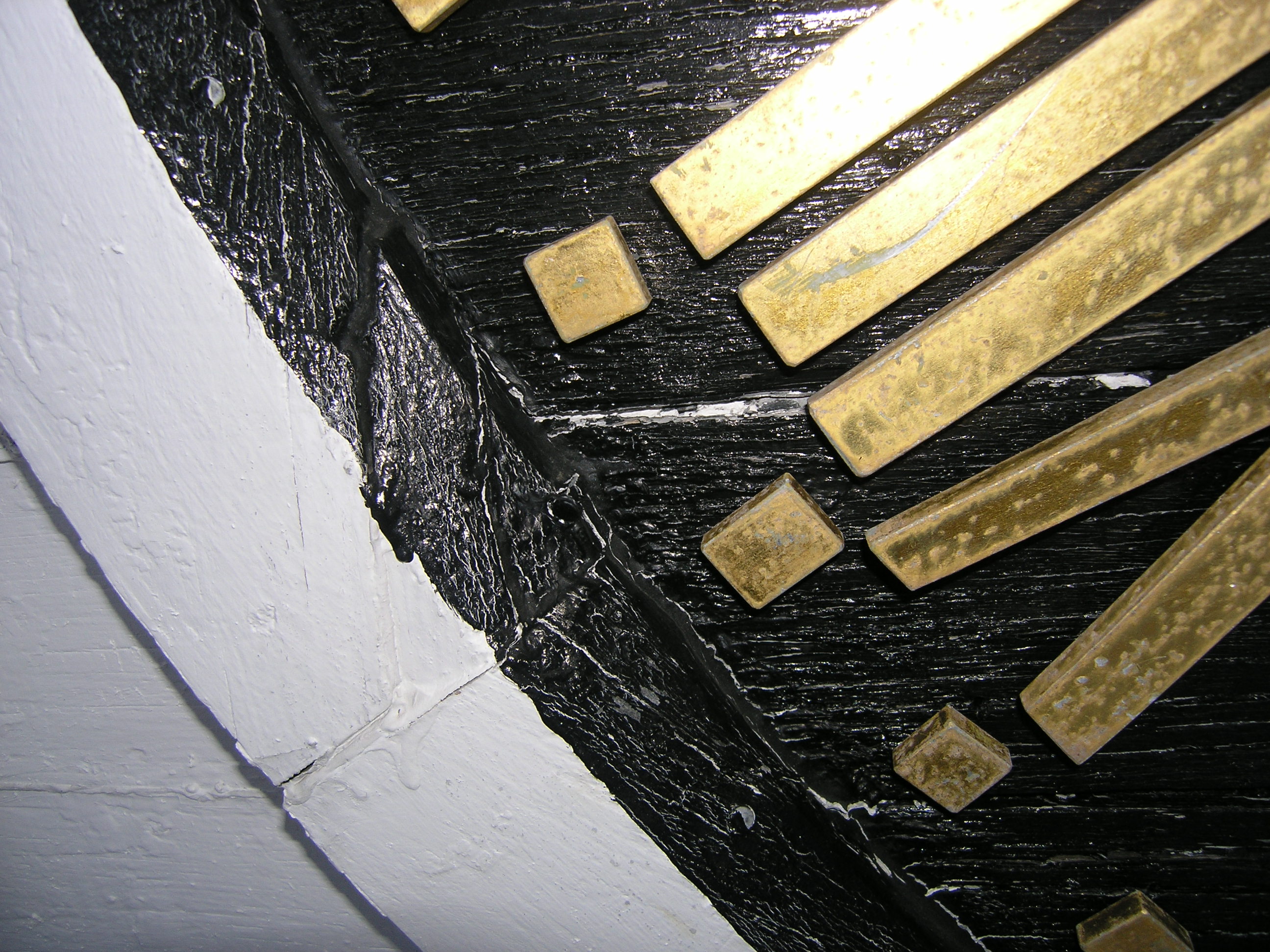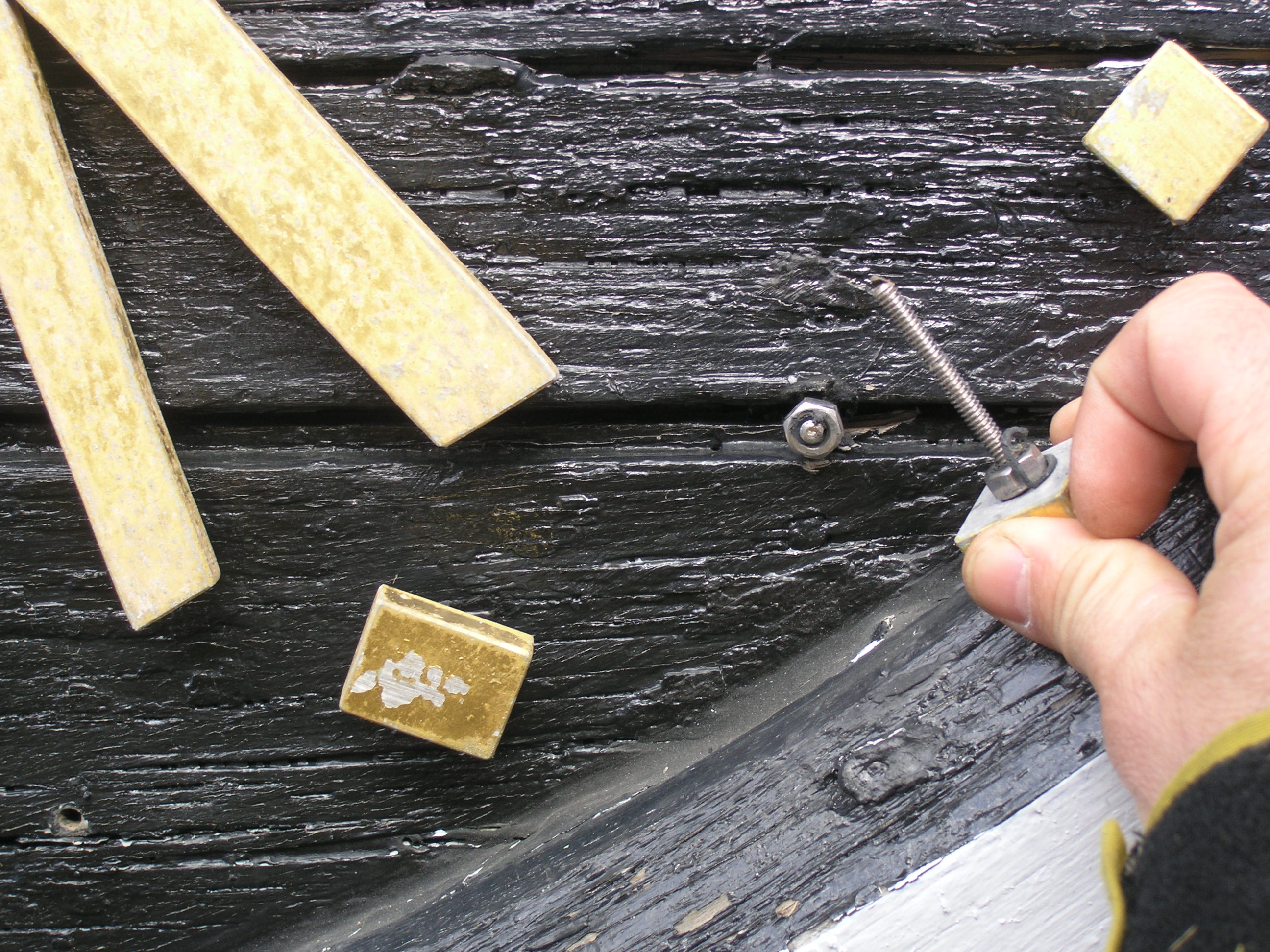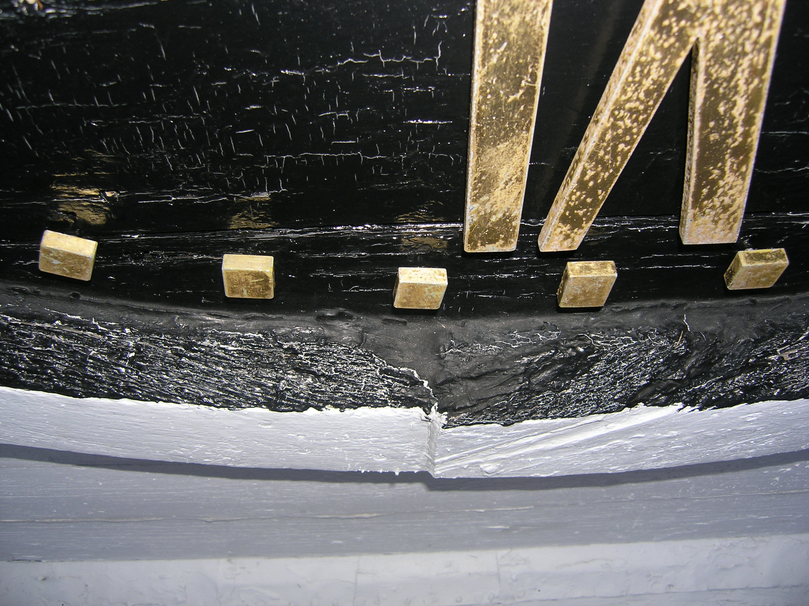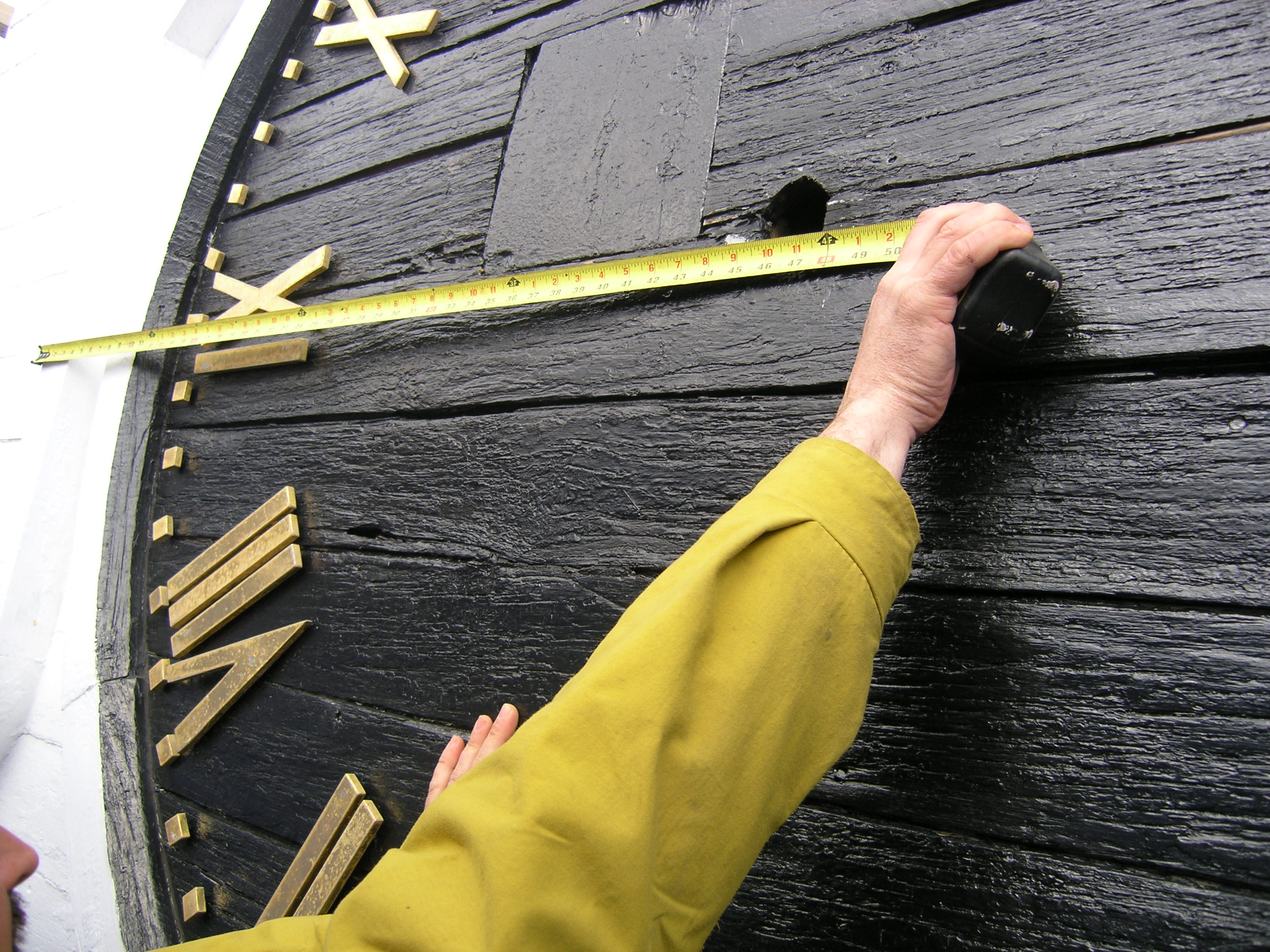 It is time for this old girl to get a face lift. Her frown lines brim with caulk. The clock faces are simply painted on the flush siding and framed with trim applied directly to the surface. Considering the lack of flashing, the trim has held up well, and we suspect that we will be able to restore and reuse approximately 75% of it. The white painted sides are in good shape, but because the faces are painted directly on the siding, we will have to replace the paneling totally. We speculated that the deterioration of the black portion was due to the increased heat absorption and movement of black painted wood, but concluded that the difference in wear was more likely due to better maintenance of the white portion. It is much easier (if you can call painting a steeple easy) to slap white paint on the trim and outer siding, than removing the numbers for painting, and cutting black paint in around the trim. But we can only apply makeup for so long, and at this point, this clock tower’s going under the knife. Click on the photos below for more information.