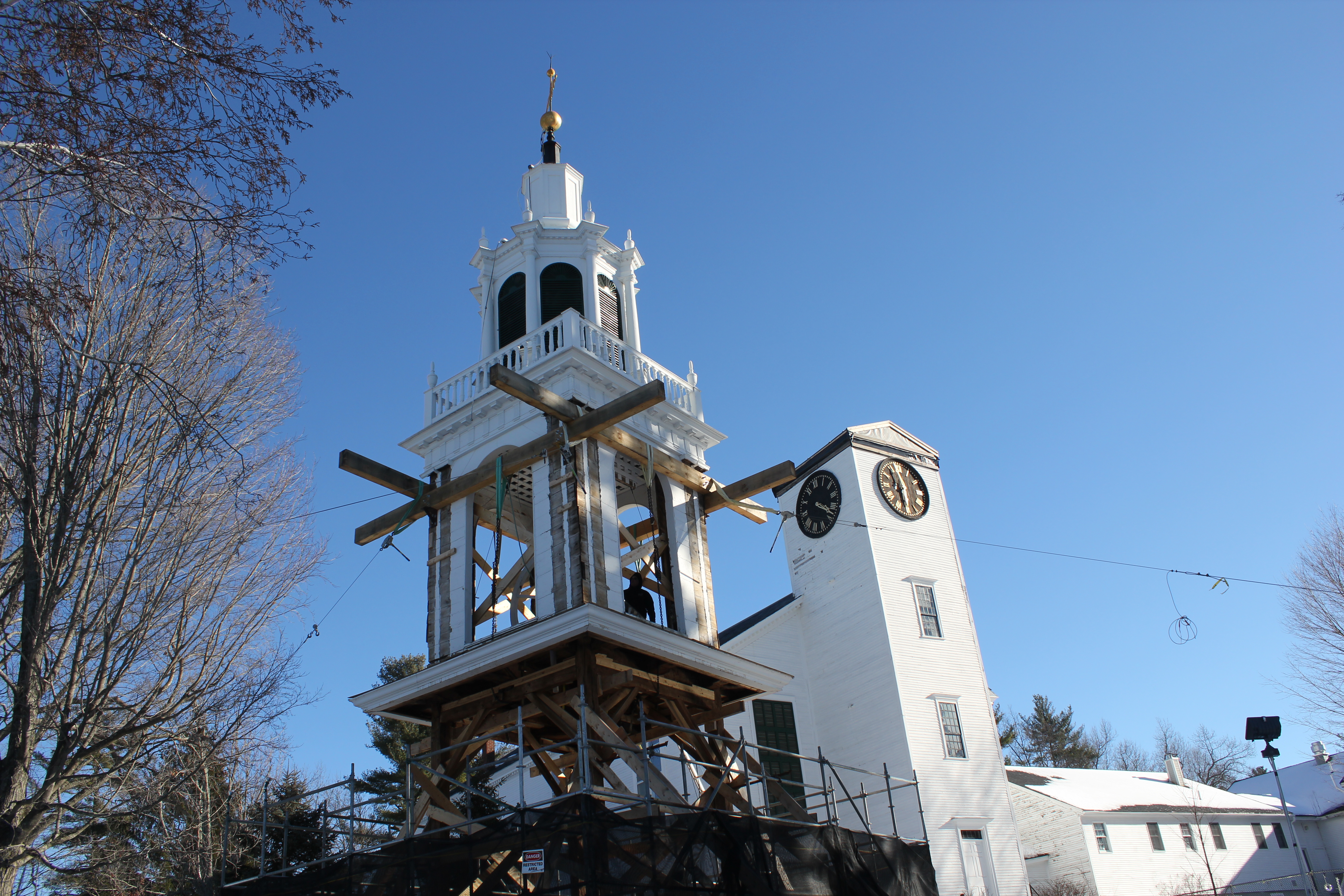 The First Parish Church is the biggest, heaviest building that we’ve ever lifted (thanks to Rick Geddes of Geddes Building Movers). The building was estimated at 188 tons, but actually weighs 288 tons. For the first time in PTF history, we bent a lifting bracket, as well as the shaft on a hydraulic jack (which is why we always use redundant rigging, and shim hard to ground). “It’s been quite a challenge,” says job lead Brian Cox. A poorly conceived connecting ell was dumping water and moisture onto the historic meetinghouse, resulting in a nearly complete undercarriage replacement. Almost a year ago, we removed the steeple from the building and placed it on the front lawn to await repairs. In the early spring, the building was lifted, a new 4’ basement was excavated and concrete foundation poured. In May, the church was lowered onto its new foundation. Throughout the summer, Brian Cox, Dan Boyle, Seth Richard and Kirk Hennequin have been working diligently to replace any rotten girts and floor joists. Paul Lindemann on the restoration committee has kept a thorough blog to document their process and progress, and the building’s history. Read more here.