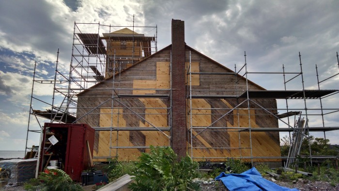 The restoration of the Wood Island Life Saving Station, in Kittery Harbor, has had Arron and his salty crew of Tom, Dave, Jake, Tim, Scott, Jess, Gail and Kendall up to their armpits in work. The life saving station was built in 1908 for the U.S. life saving service and became part of the coast guard in 1915. The U.S. Navy used the site to defend Portsmouth Naval Shipyard against U-Boats during World War II. Since the early 1950’s, the life saving station has been unused. Although the island is a popular destination for kayakers launching at Fort Foster, the building fell into dangerous disrepair, with radiators dropping through the floors. The Wood Island Life Saving Station Association applied for National Register status based on the building’s historic significance, and the integrity of the original interior trim and cabinetry. Over the summer, the intrepid crew rebuilt the boathouse, porches and dormers. As ever, sheathing repairs revealed more extensive rot than expected, but we’re finally finished with taking things away, and can focus on rebuilding. This week, we commenced with hanging reproduction trim milled right in our shop in Berwick. I’ve worked in wind like that on one other job-site: Mount Washington. We hope to have the building roofed by the end of September, which will mark the completion of phase one. And we’ve had some good press, from the Portland Press Herald to the Associated Press. Read more here.