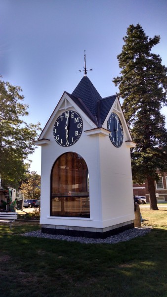 The small Northern contingent of Lee, Jake, Scott, Seth and Jess built the Hampton Town Clock Tower this Spring and Summer. The standalone clock tower is building-sized display case for Hampton’s historic Howard round top tower clock. The 8-day clock, with dials that read “M E M O R I A L G I F T” instead of numerals, was given to the town in 1897 and ticking in the Odd Fellows Block until the building was destroyed by fire in 1990. The building is a design departure for PTF, as it references the Odd Fellows Tower, but does not replicate it. The four gable roof, topped with a “witch’s hat” spire, and four corner pent roofs was taken from the original building. Below, the body of the building is much simpler than the Odd Fellows tower. The 10’ arched windows reference the original arches, but the elaborate corner trim was eliminated, allowing the historic clockworks to take center stage. The clock will stand on a low lofted floor above the bell, making the clockworks accessible to its civic owners for the first time in history. Phil D’Avanza is completing repairs on the clock, and Skip Heal, of Northeast lantern, donated an enormous reproduction of the original weathervane. Read more about history of this clock, from installation, through destruction, disappearance and ultimate restoration.