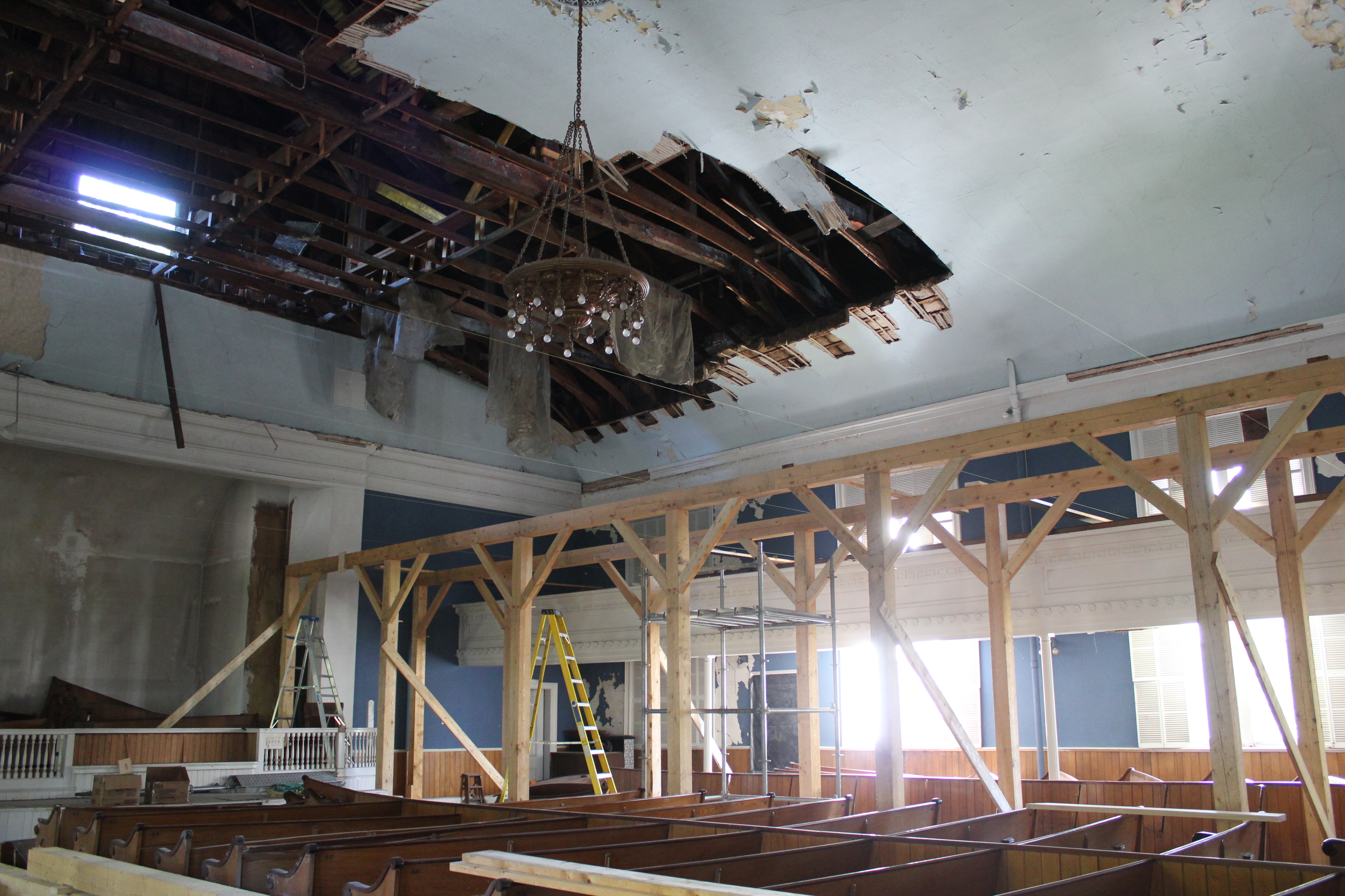 In August 2015, high winds shook loose nearly a third of the coved ceiling at the Winter Street Center in Bath, ME. Enormous swaths of plaster and lath crashed onto the pews, and hung loosely from the trusses. Remediating and repairing the 26’ high ceilings posed a unique challenge. The sanctuary needed to be cleaned of hazardous debris, and the rest of the dangling plaster needed to be removed. Following the removal, Sagadahoc Preservation will need to raise the funds to make necessary truss repairs and ultimately reinstall the ceiling. The process is expected to take years, and a lot of staging. Given the original timber framed floor framing, with large, widely spaced girts and joists, and the time-span of the project, it made more sense to build a timber-framed deck 13’ above the floor, and cantilevered over the balcony. The deck is perfectly flat, and allows EnviroVantage to safely remove the ceiling where it is 6’ above the deck at the eaves, and from rolling baker’s staging at the center of the room. The timber deck even allows Sagadahoc to continue to use and show the sanctuary as they fundraise for the next phase. Jake Imlay wrote a great post describing the building and our approach there. Coming soon.