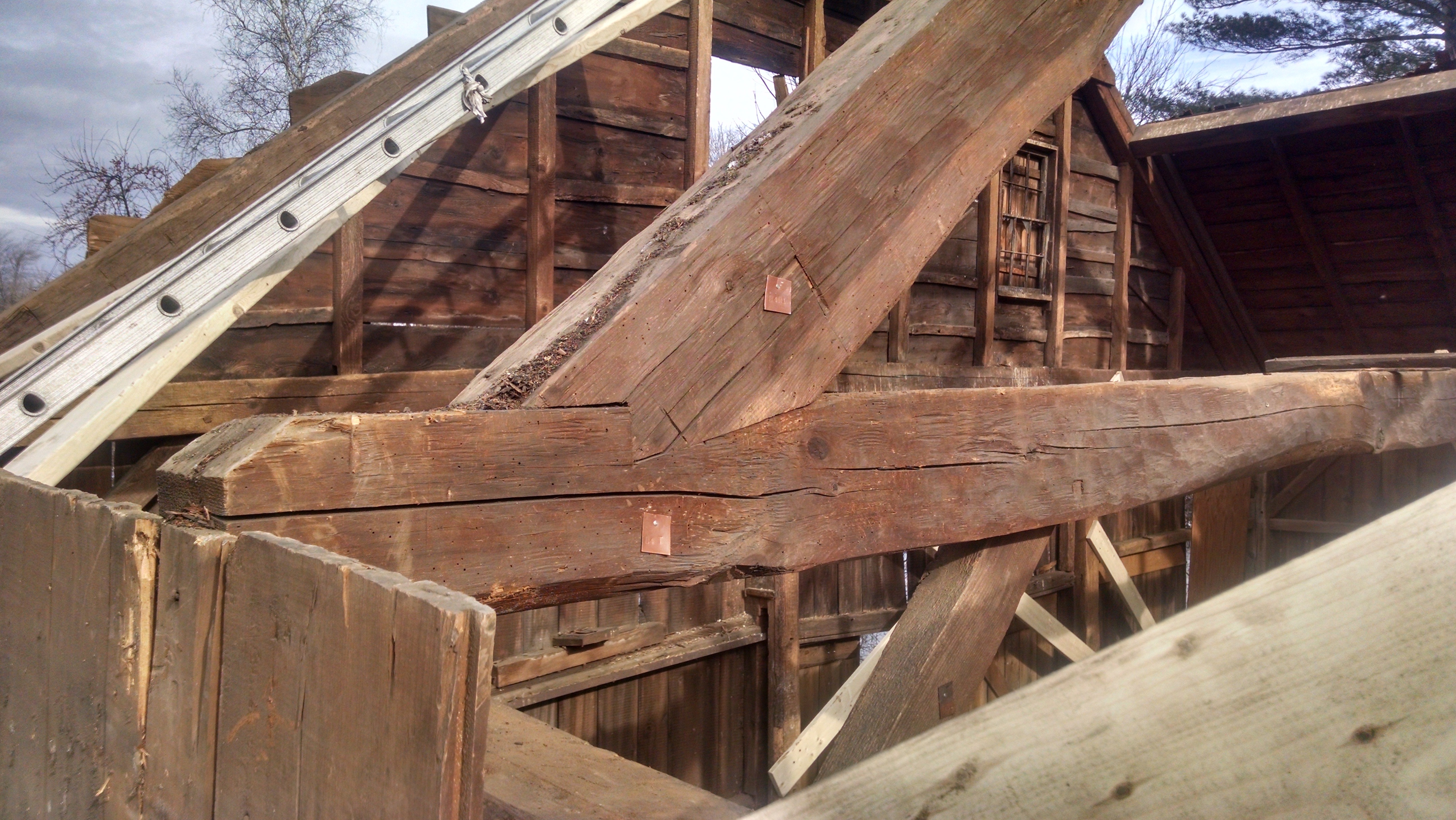 The Lord Barn is one such example. Over the past decade, the barn had emulated a pat of butter on hot toast. Its fieldstone foundation was slipping, and the eave sills had rolled out from under the plates. The building looked dangerous to teenagers. With this kind of failure, we expected to find a lot of rot. But with the corrugated metal roof and deep overhangs, water infiltration was never the main problem. There was plenty of air flow, so bulk moisture wasn’t being trapped inside the building. While the foundation and undercarriage melted into the ground, the timbers above stolidly endured.