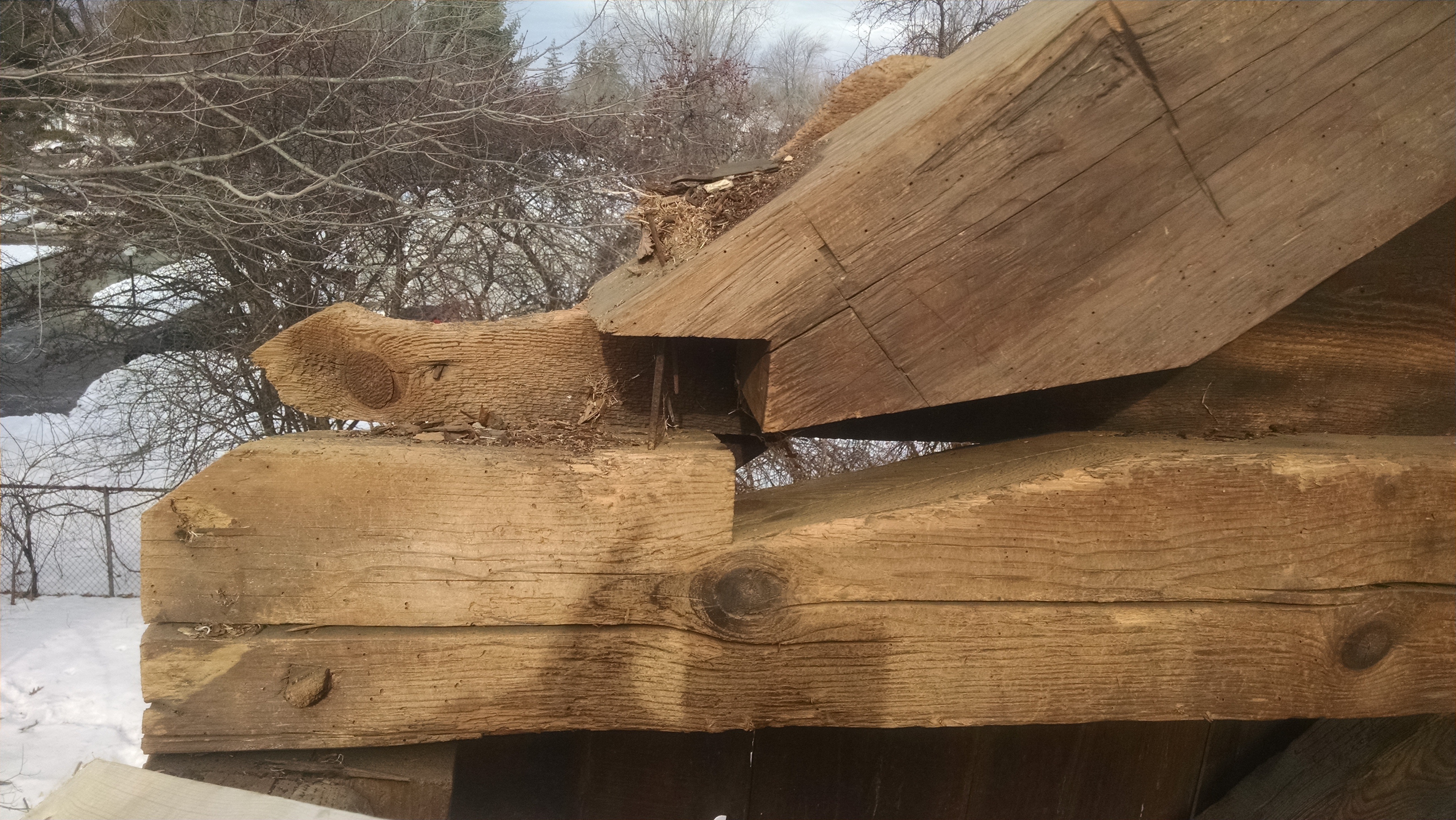 The left eave sill rolled right off the foundation, pulling many of the left eave posts with it. It racked the entire frame, the posts pulling away from the loft girts. The tenon relish, just past the pinhole, was sheared in nearly every loft girt, and in many of the post tops, too. In bents where the post-tie beam connection held strong, the end of the tie beam dropped dramatically away from the rafter.
