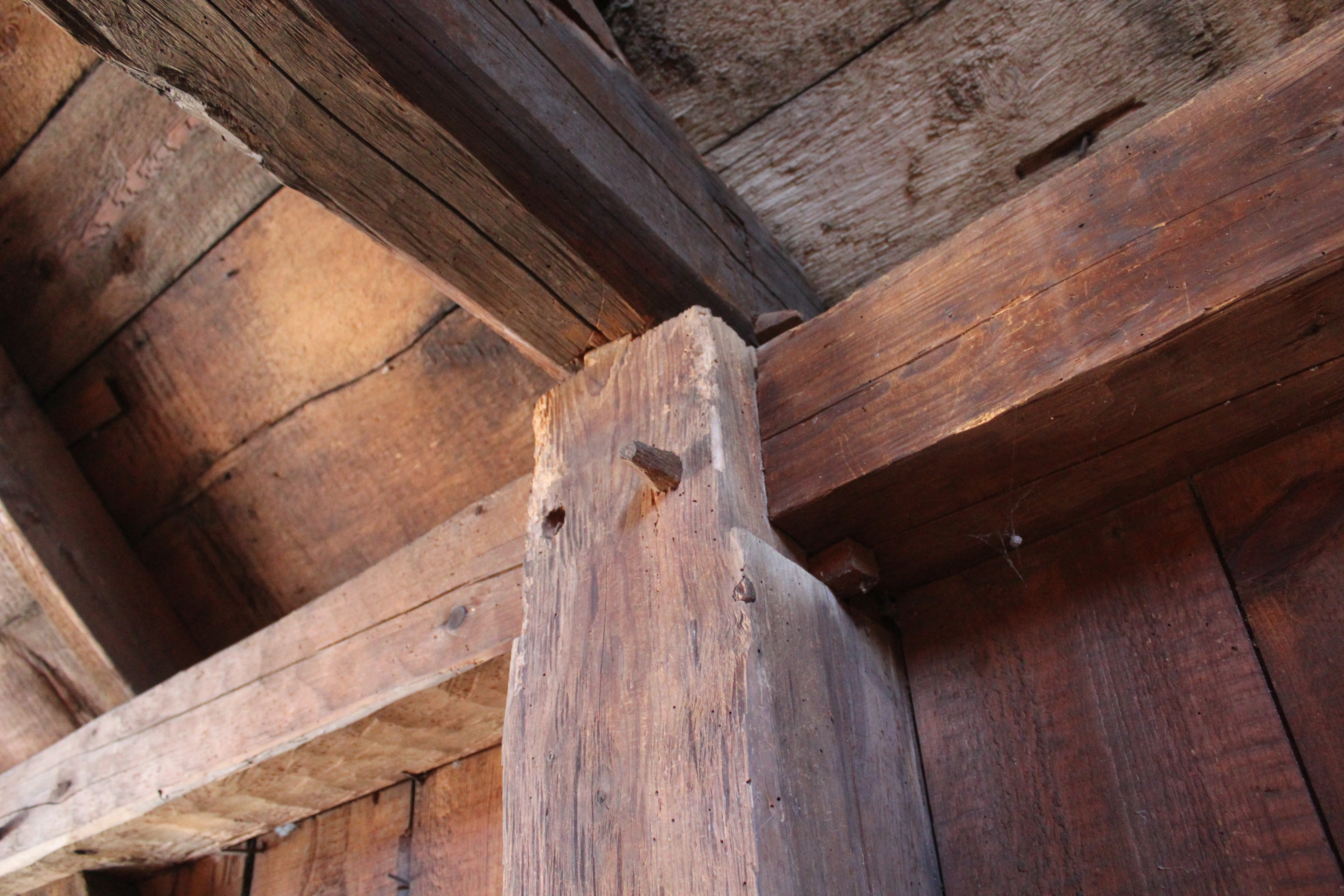 Dating a barn like this is hard, and not just because it’s a hot mess. Many of the larger beams, the tie beams, rafters, plates, and posts, are hewn, which means that their surface was smoothed with an adze or broadaxe, resulting in a texture like hammered copper. Hewing was replaced by up-and-down milling throughout the 19th century, depending upon proximity to a sawmill, and frugality. But the frame design and joinery of the Lord Barn follow later trends, especially the plate/post connection. The plates are discontinuous, and are joined into a mortise at the top of each post. The end of the plate rests on a 1″ let-in, or shoulder, characteristic of square-rule joinery, which became popular in the late 19th-century. Hewing is a labor-intensive and thoroughly handmade practice, while square-rule framing, although also cut by hand, was an innovation in efficiency that made pieces more uniform and interchangeable.