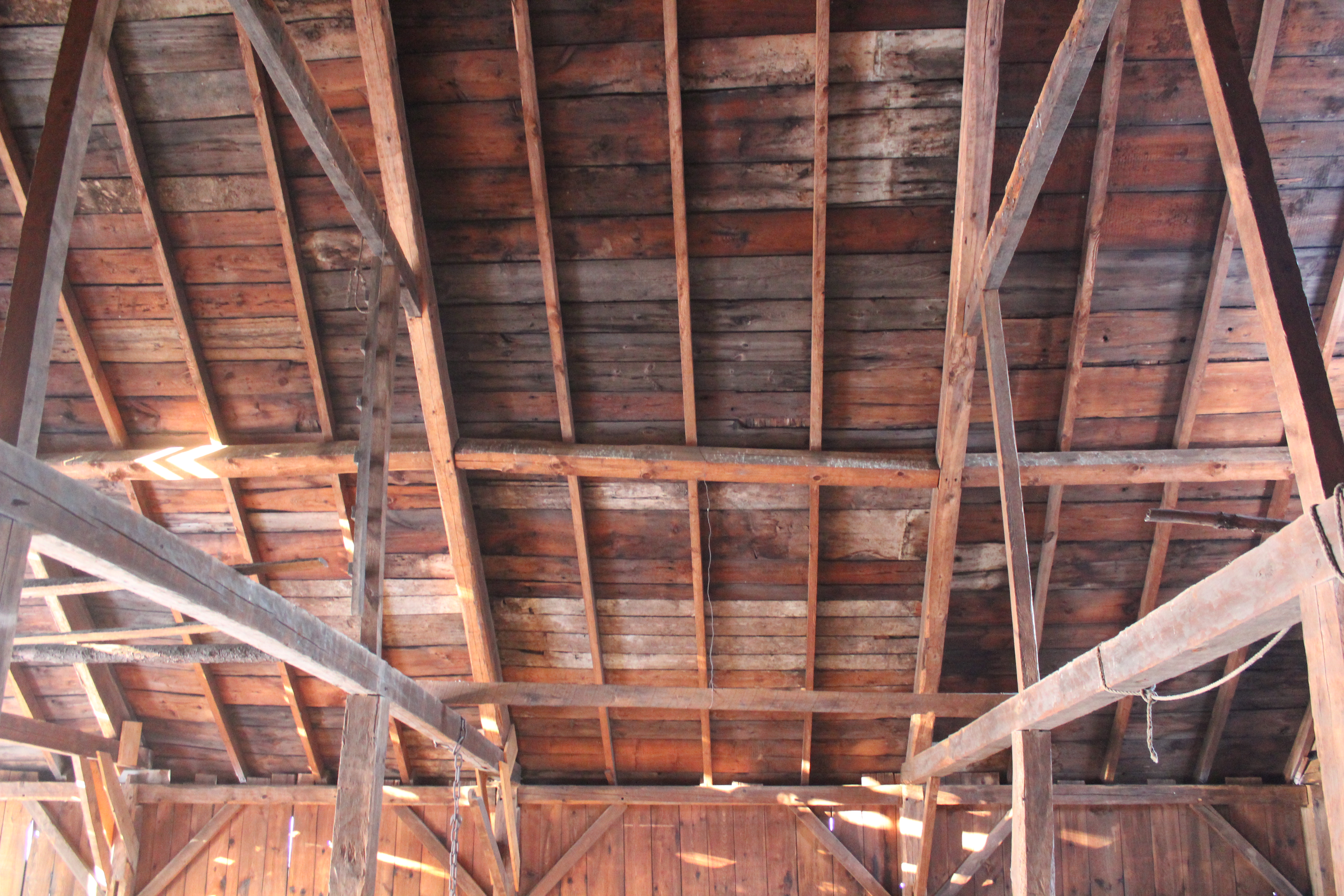 The roof system, with common rafters stacked over a principal rafter-principal purlin frame, is 1870s’ish. The common rafters are sawn and relatively small, 3″ x 5″. By stacking them over the purlins, the major roof framing is better protected. The rafters join the tie beam well inboard of the end of the tie, which means more material in the tie is resisting the outward thrust of the rafters. There is also better airflow around the principal rafters and purlins. In the Lord Barn, the common rafters run well past the plate, creating a deep overhang, which protected the sidewall framing as the sills slid and spread. The frame’s design brackets this barn between 1860-1880. We think it is a late example of a totally hewn frame.