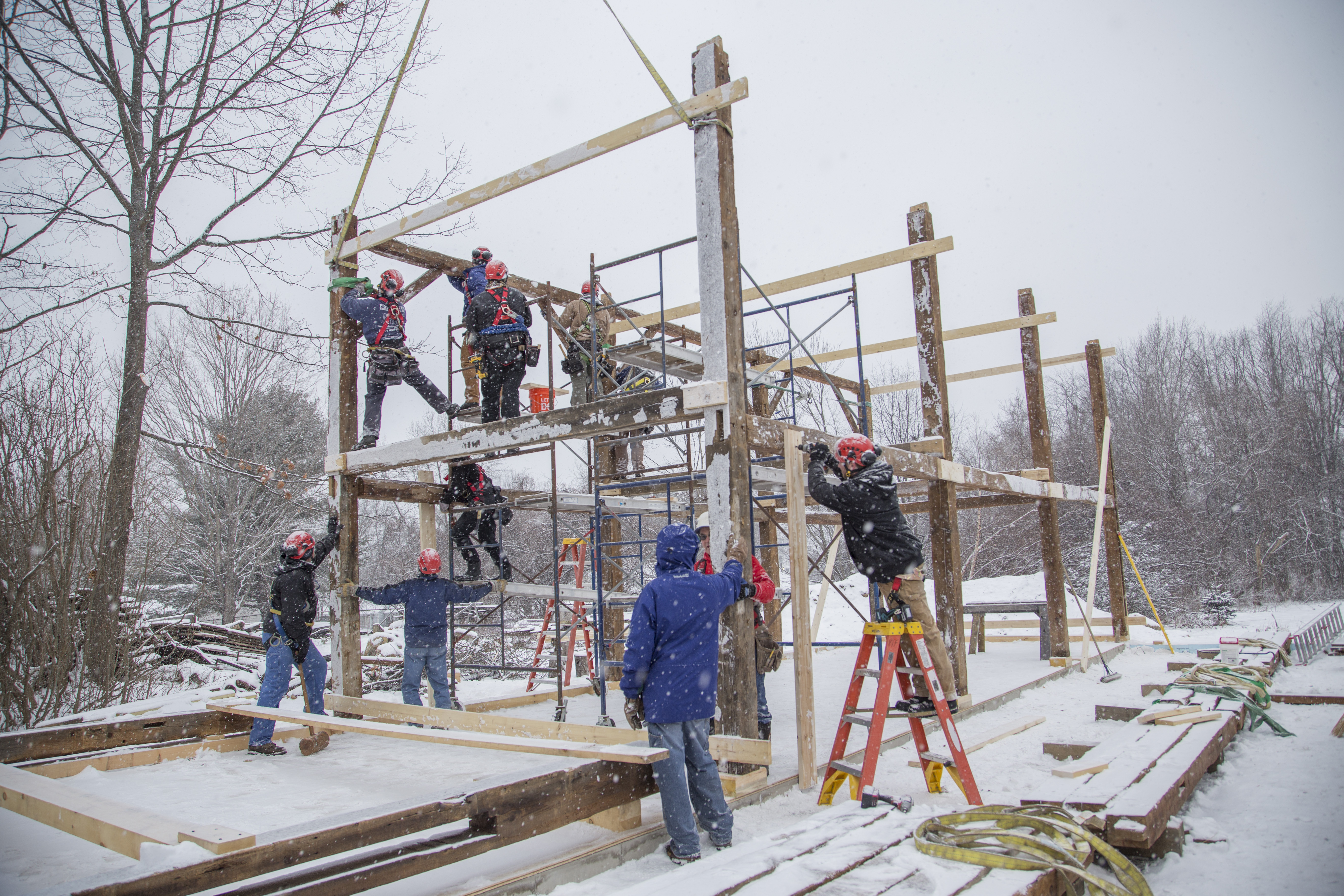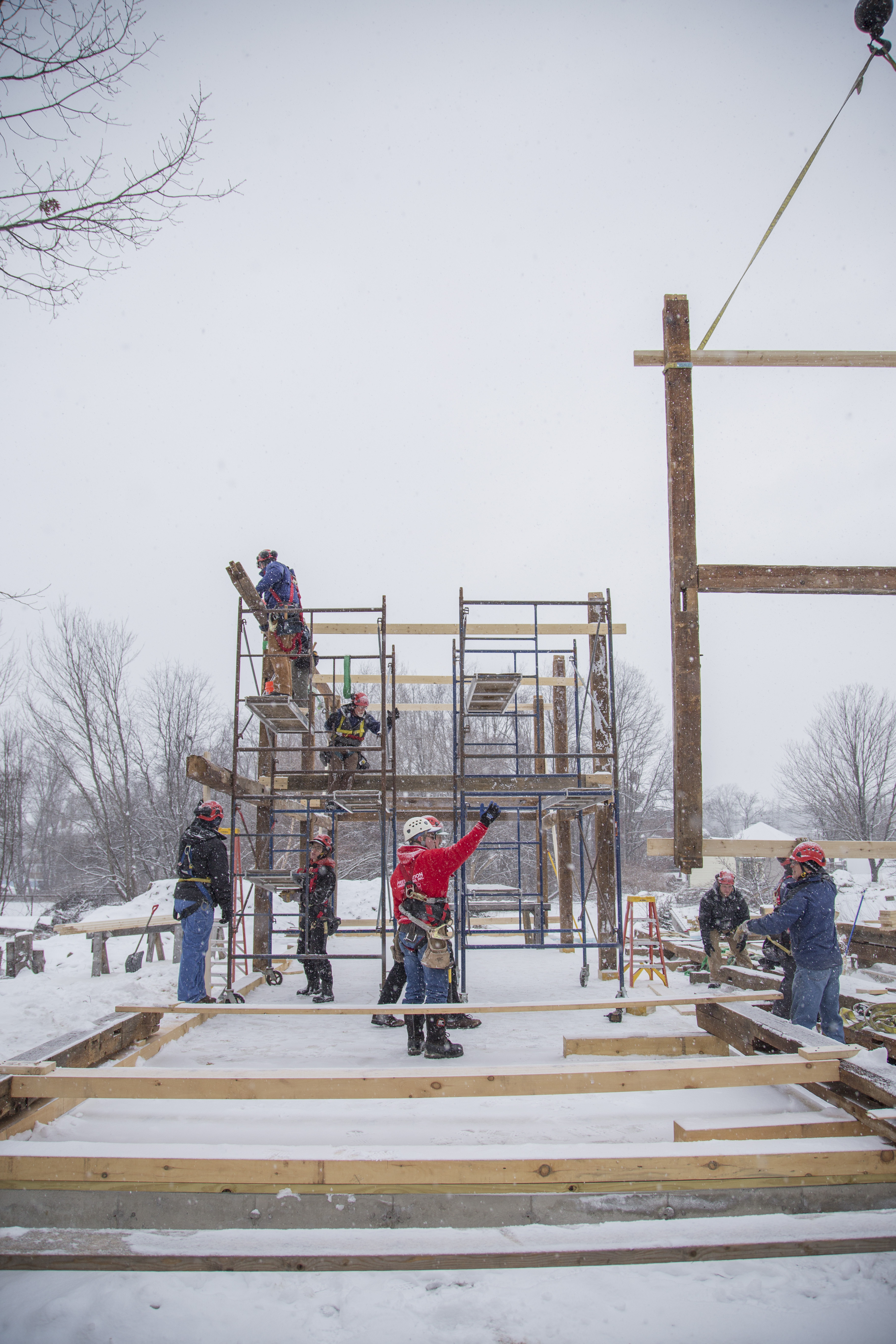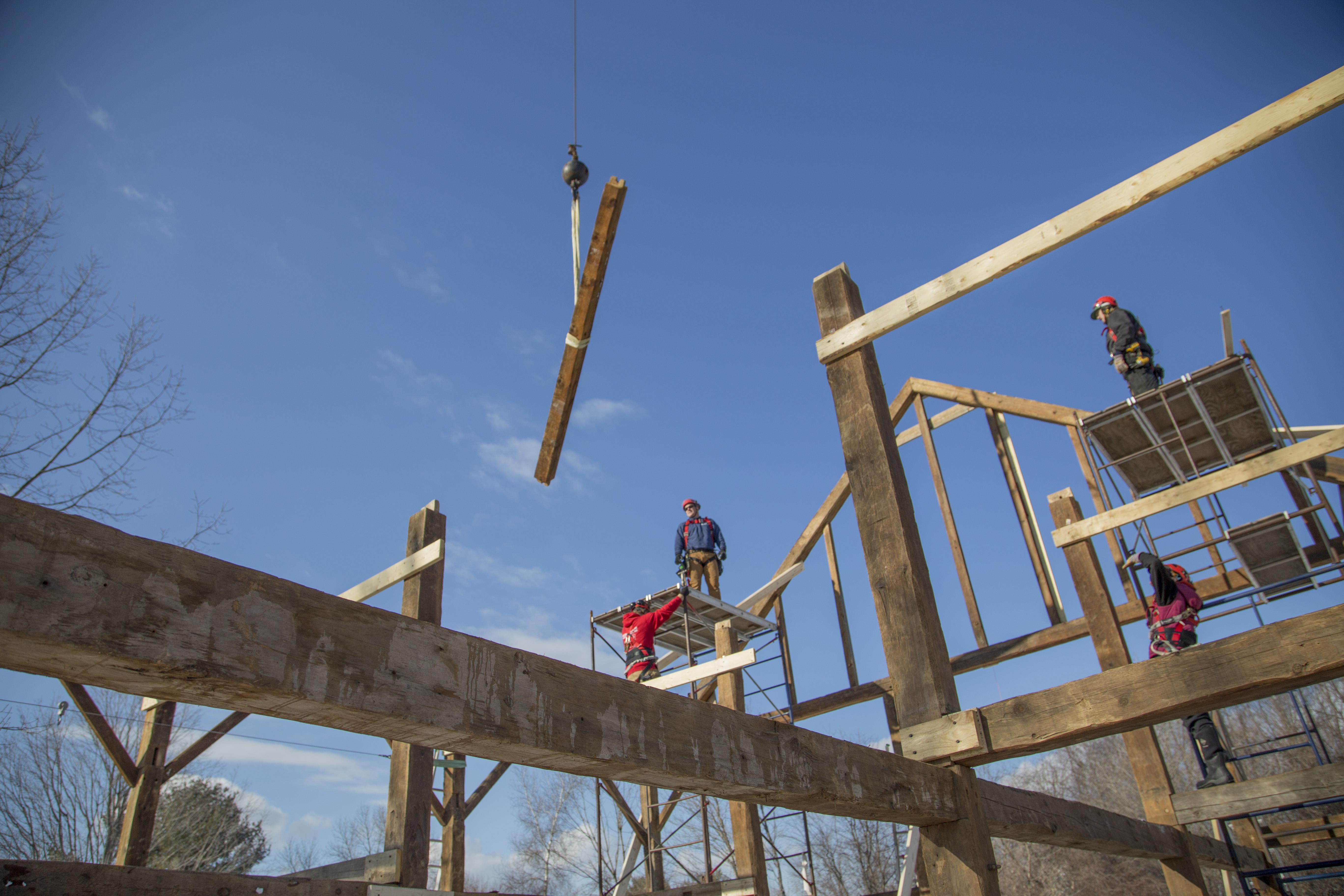 After a late lunch, the crane began flying in the upper triangles formed by the tie beam and rafters. The installation was complicated because the bottom of the tie beam needed to engage with four posts and four braces. Over time, a few of the tie beams had bent to conform to the drooping left eave, and each tie beam fit with some idiosyncrasy. Additionally, there was a pinned purlin between each pair of rafters. These beams needed to be installed by crew-members on staging at roof height. Before each tie triangle was flown, two staging towers needed to be dismantled and re-erected in the subsequent bay in order for us to be able to install those principal purlins. Every member of the crew and each of the clients were needed to erect the frame in a single crane day. It was a lot of fun.