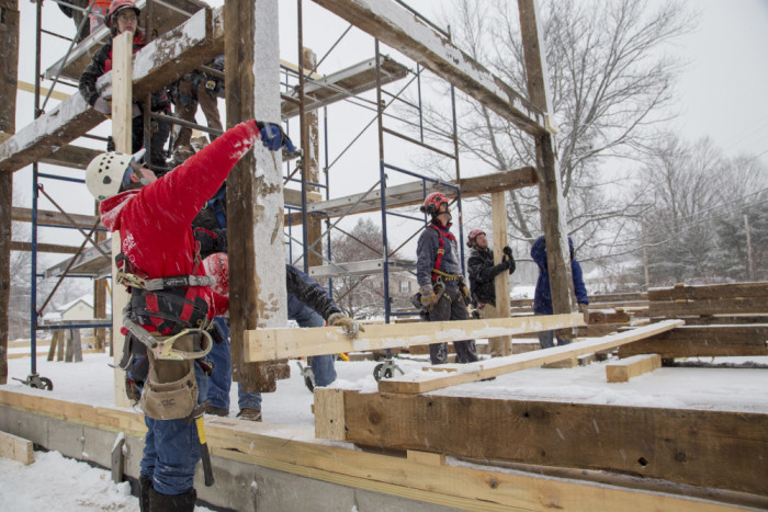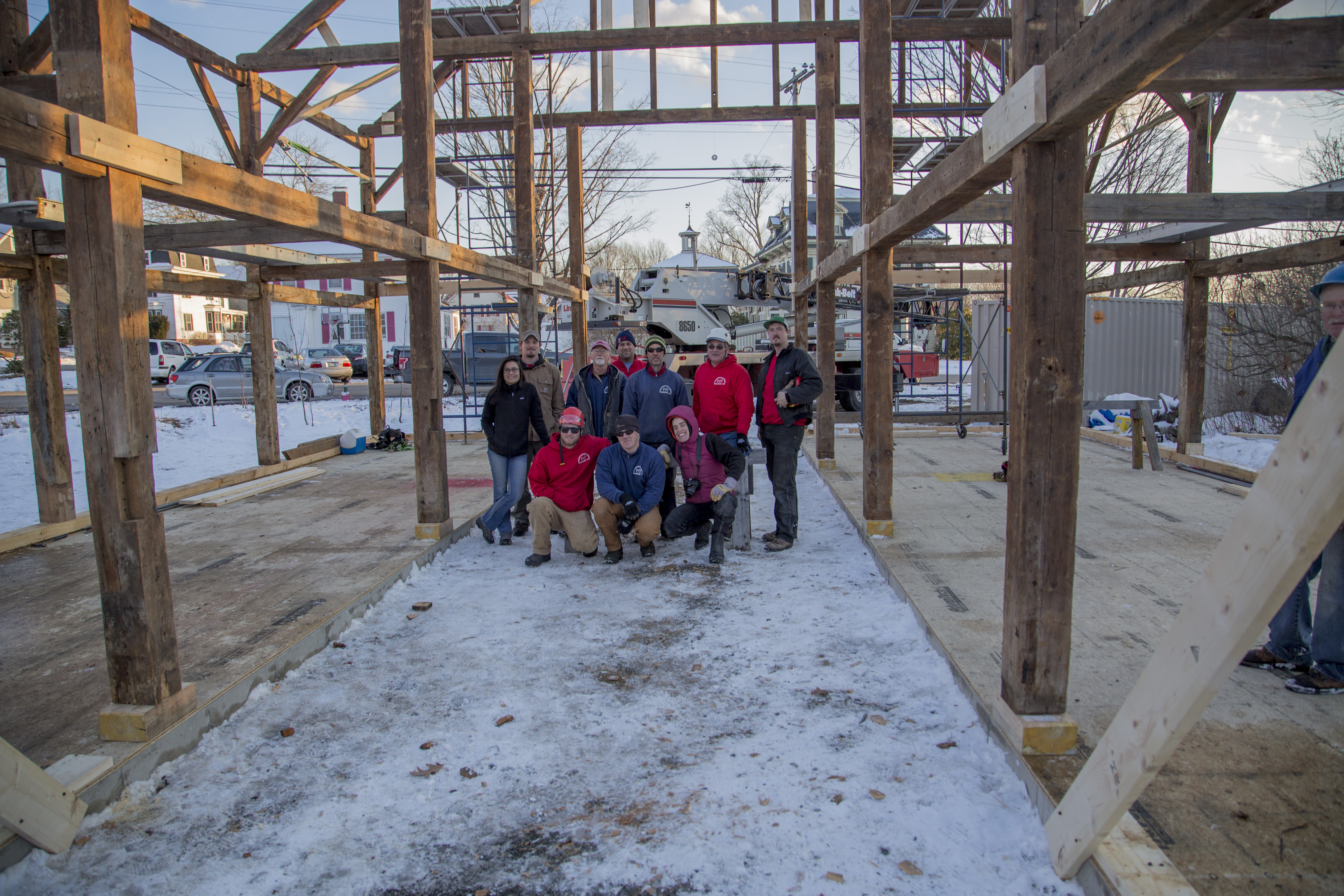 A year ago, we disassembled the barn with the entire crew. The clients, Pat and Paul Boisvert and Linda and Frank Underwood, de-nailed the timbers and helped dismantle the bents once they were on the ground.