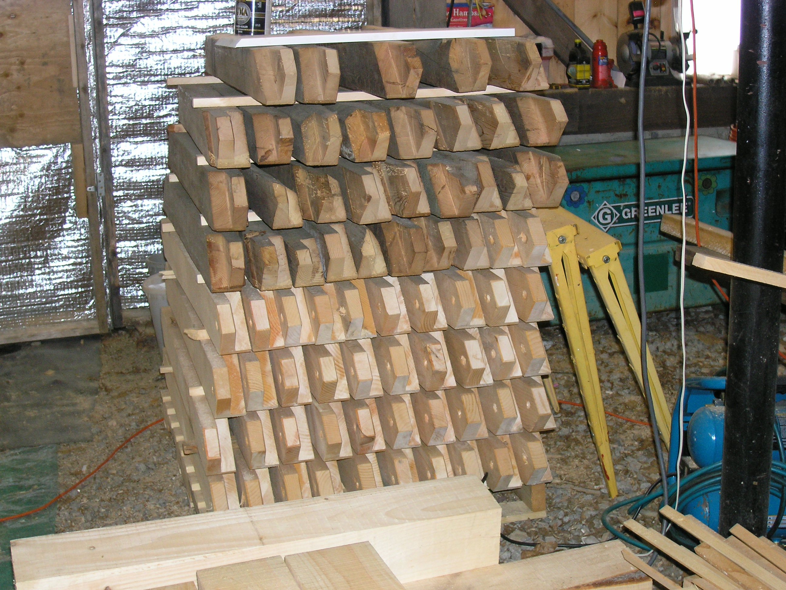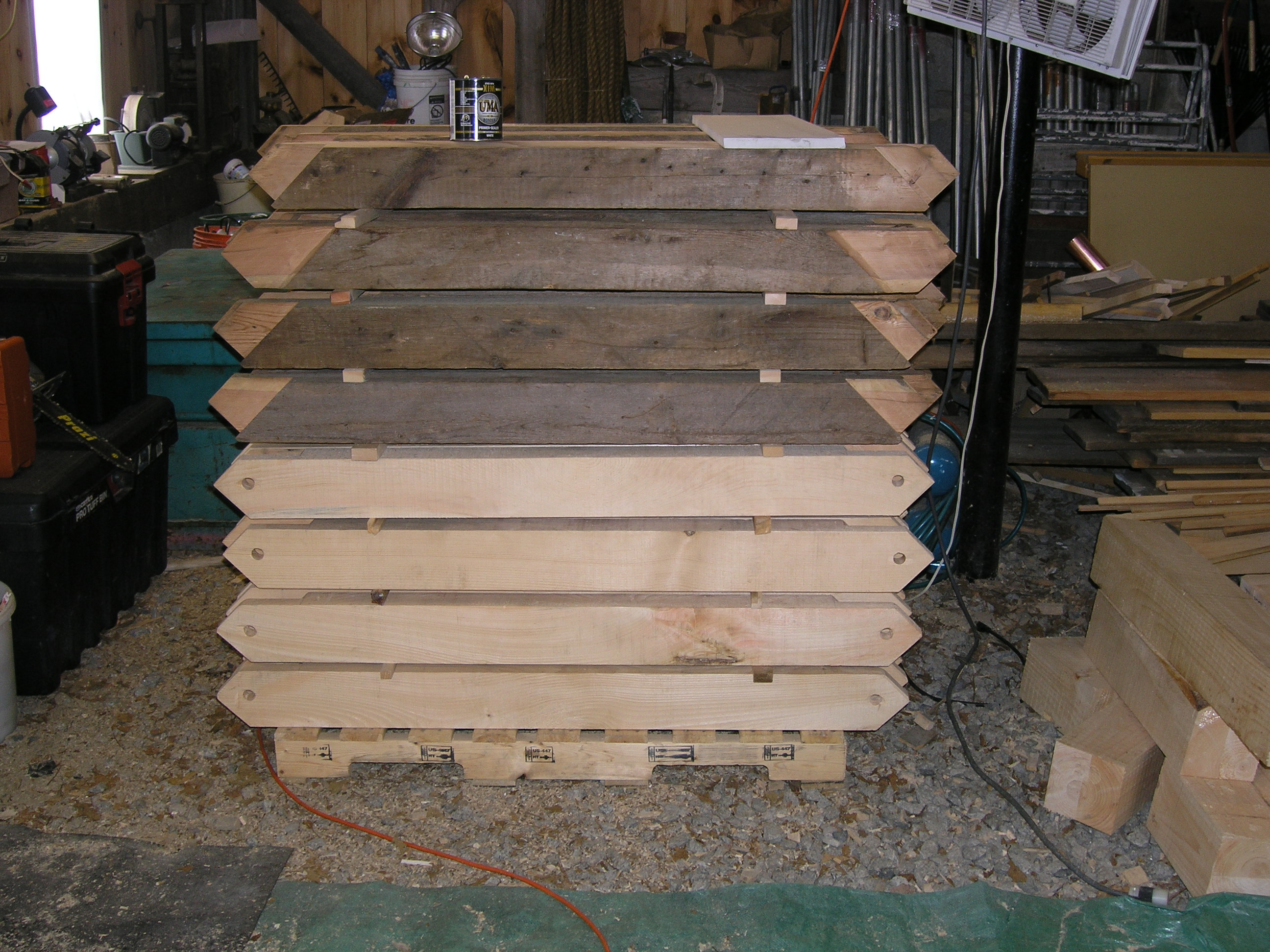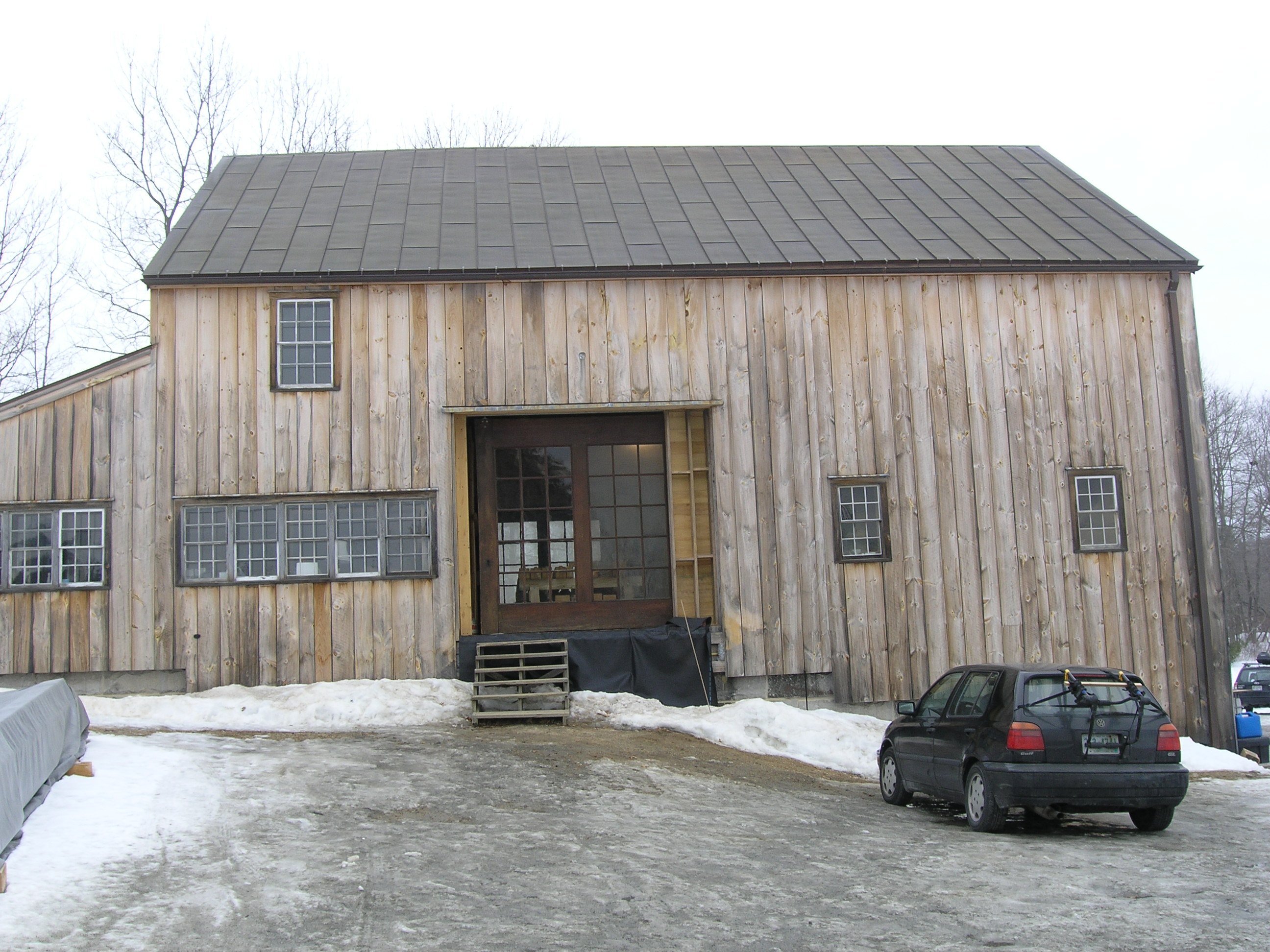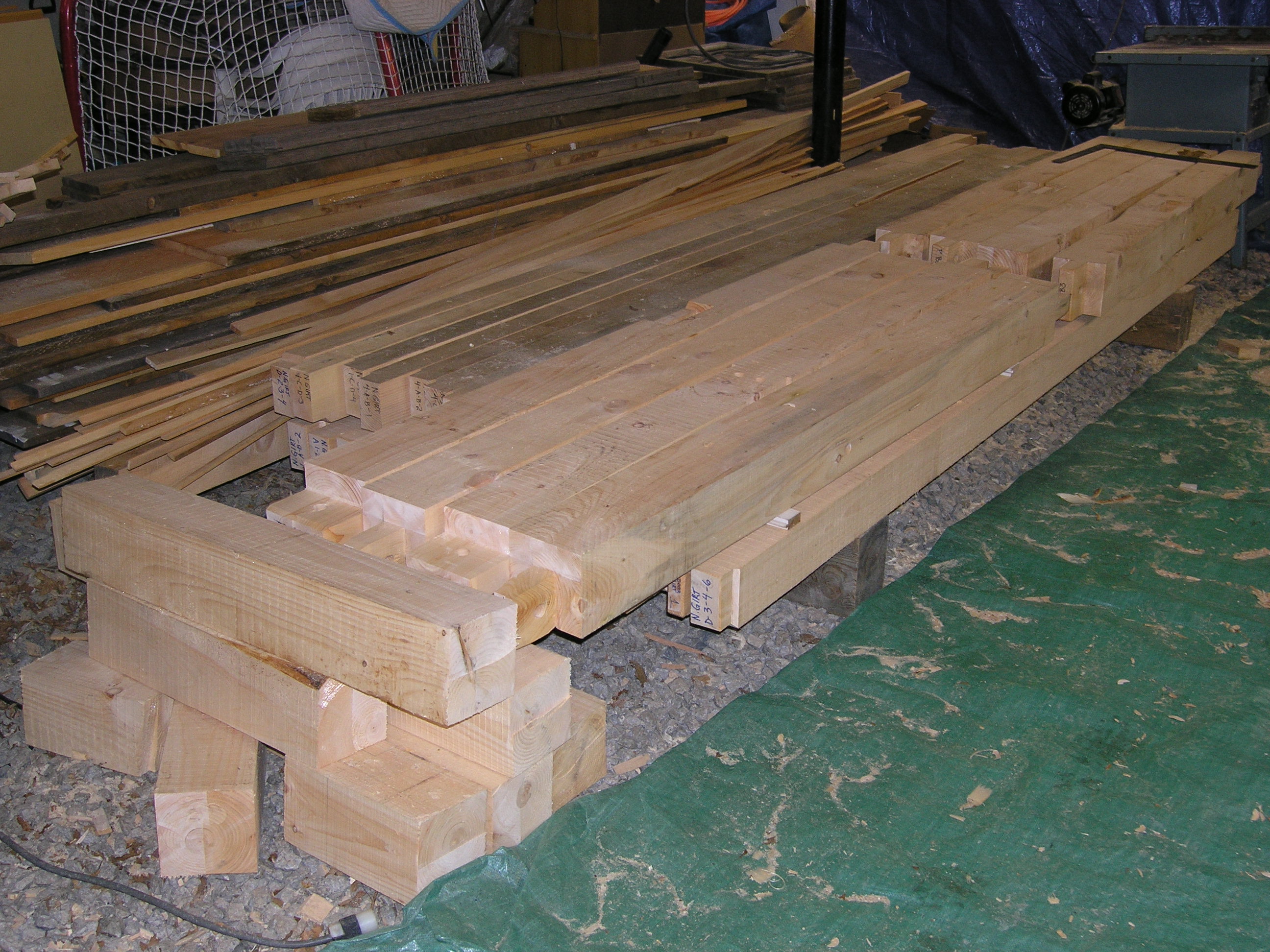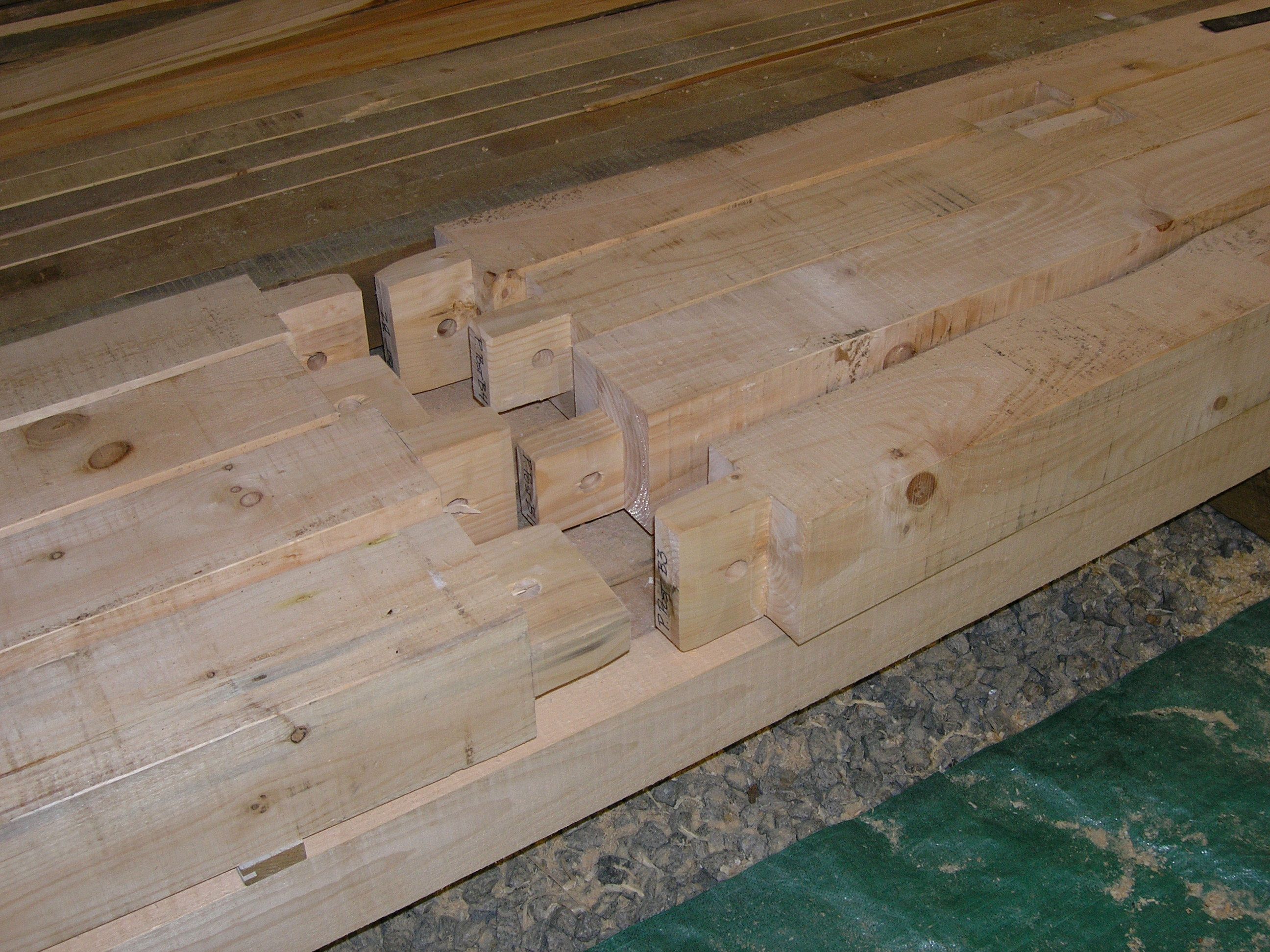 During the past few months, Ed has been busy at the shop cutting a reproduction barn frame for a client. The original barn fell in a Nor’Easter, and we salvaged as much as we could. We will re-use much of the bracing, an upper gable, and a front gable drive post that has a large slot through which the front door will slide. Click on the photos below for more information: