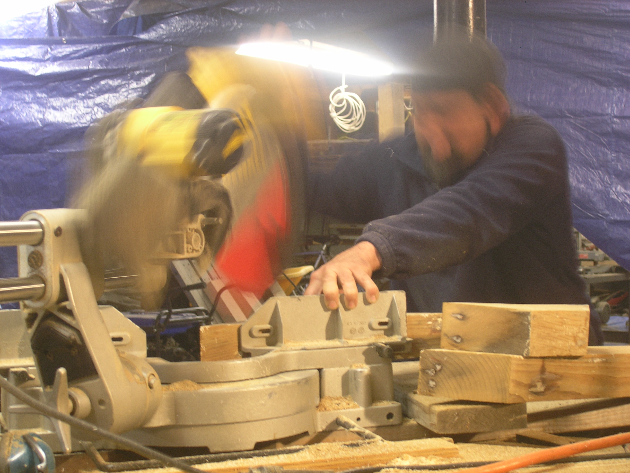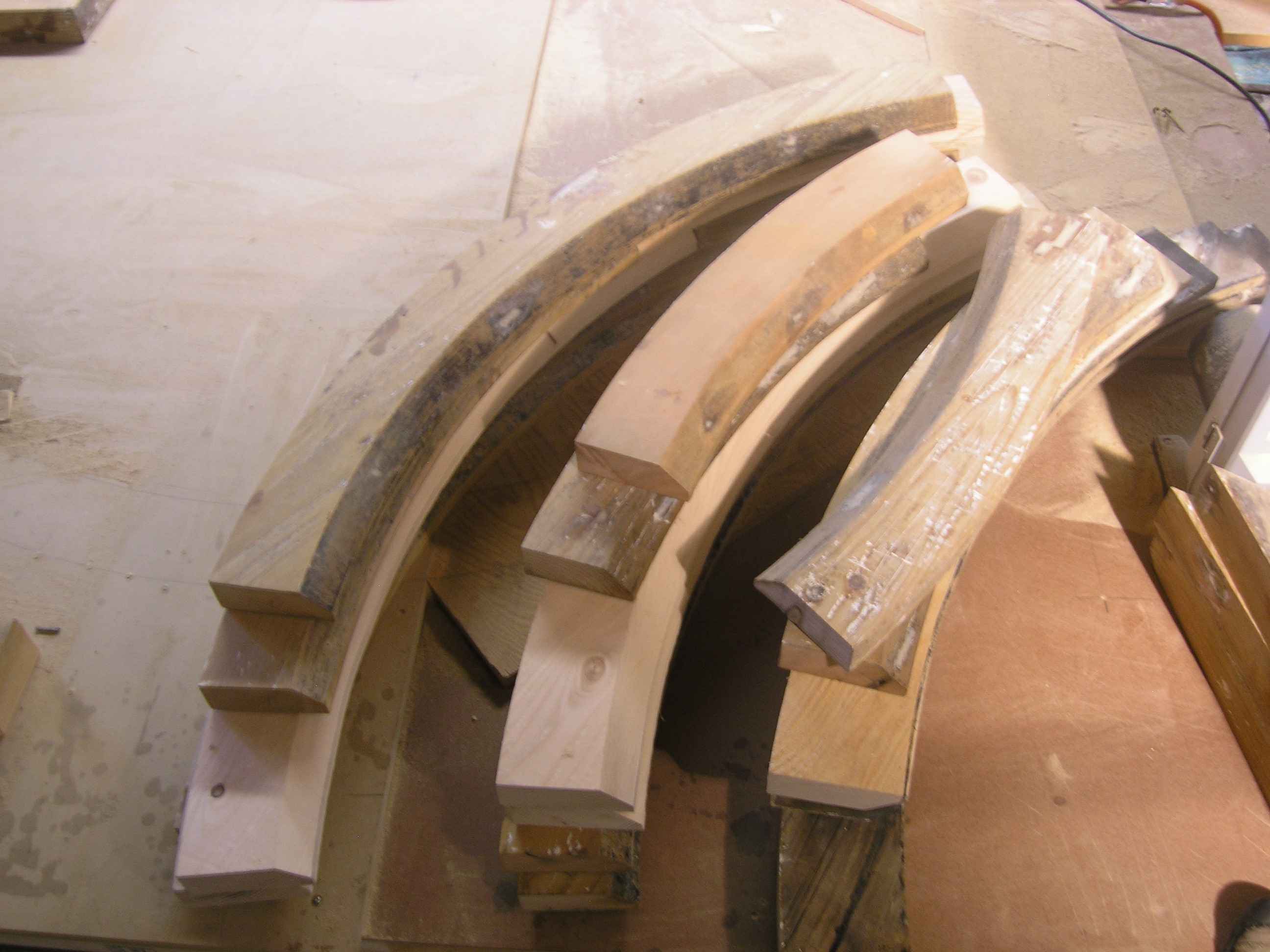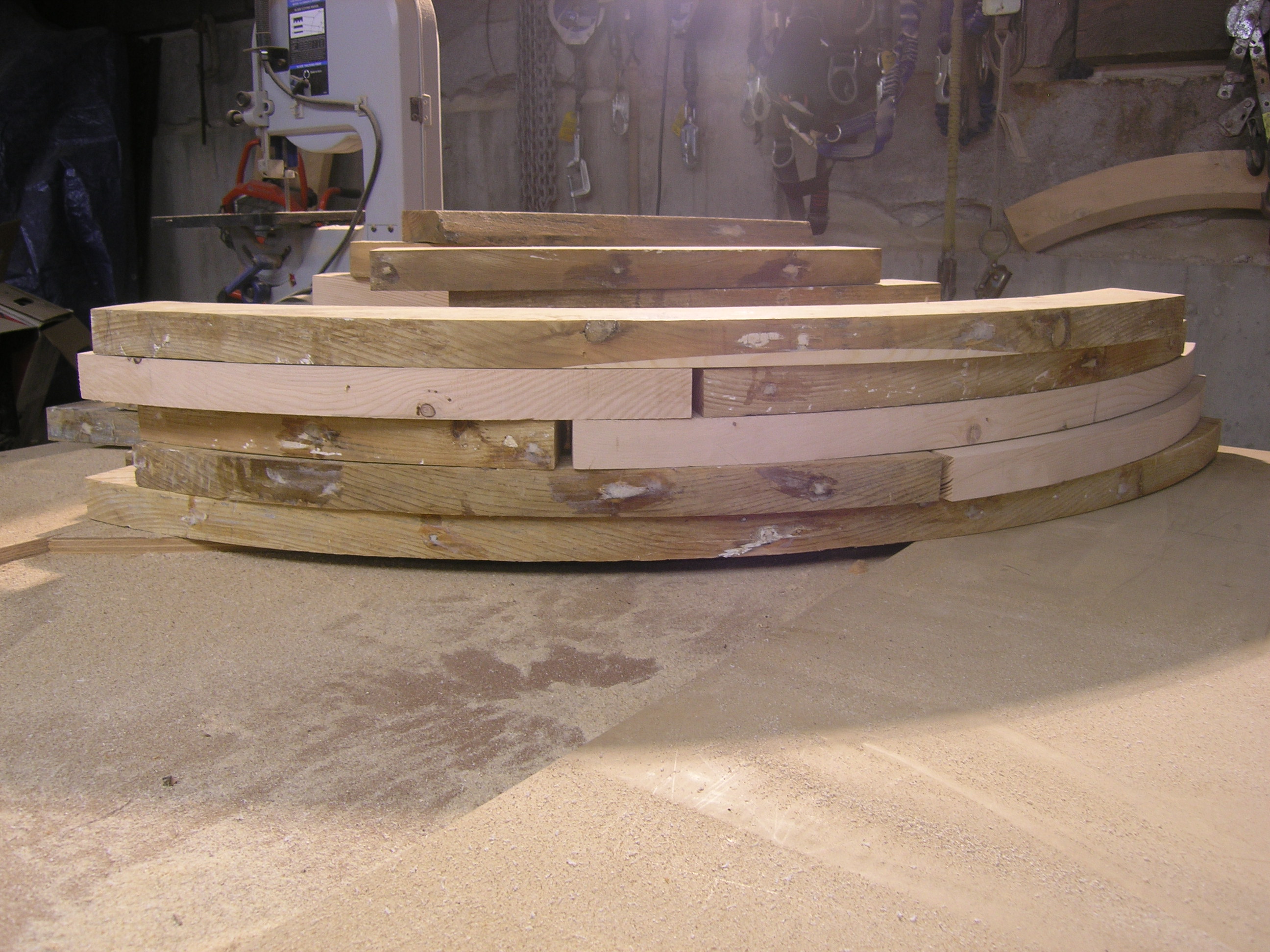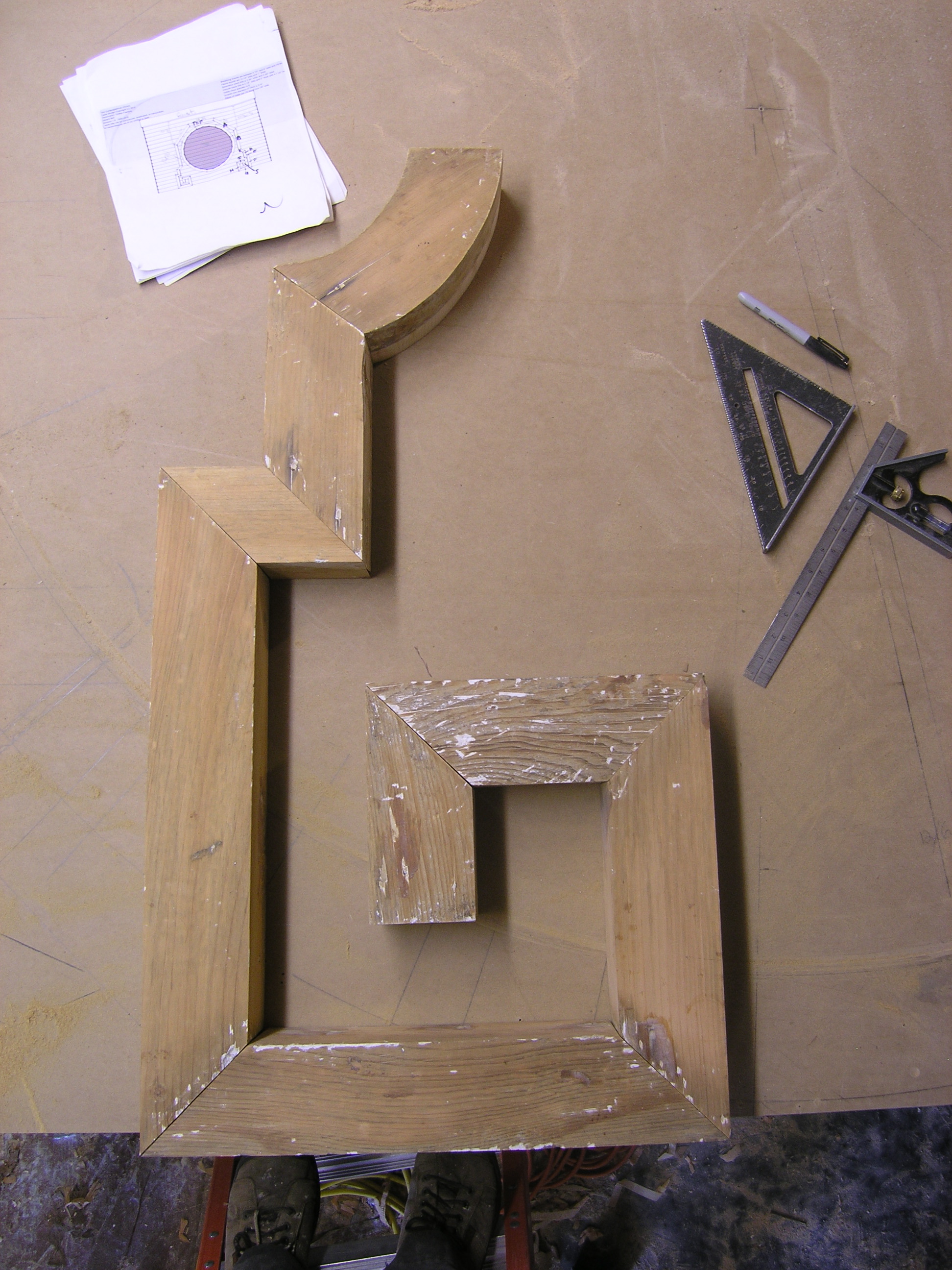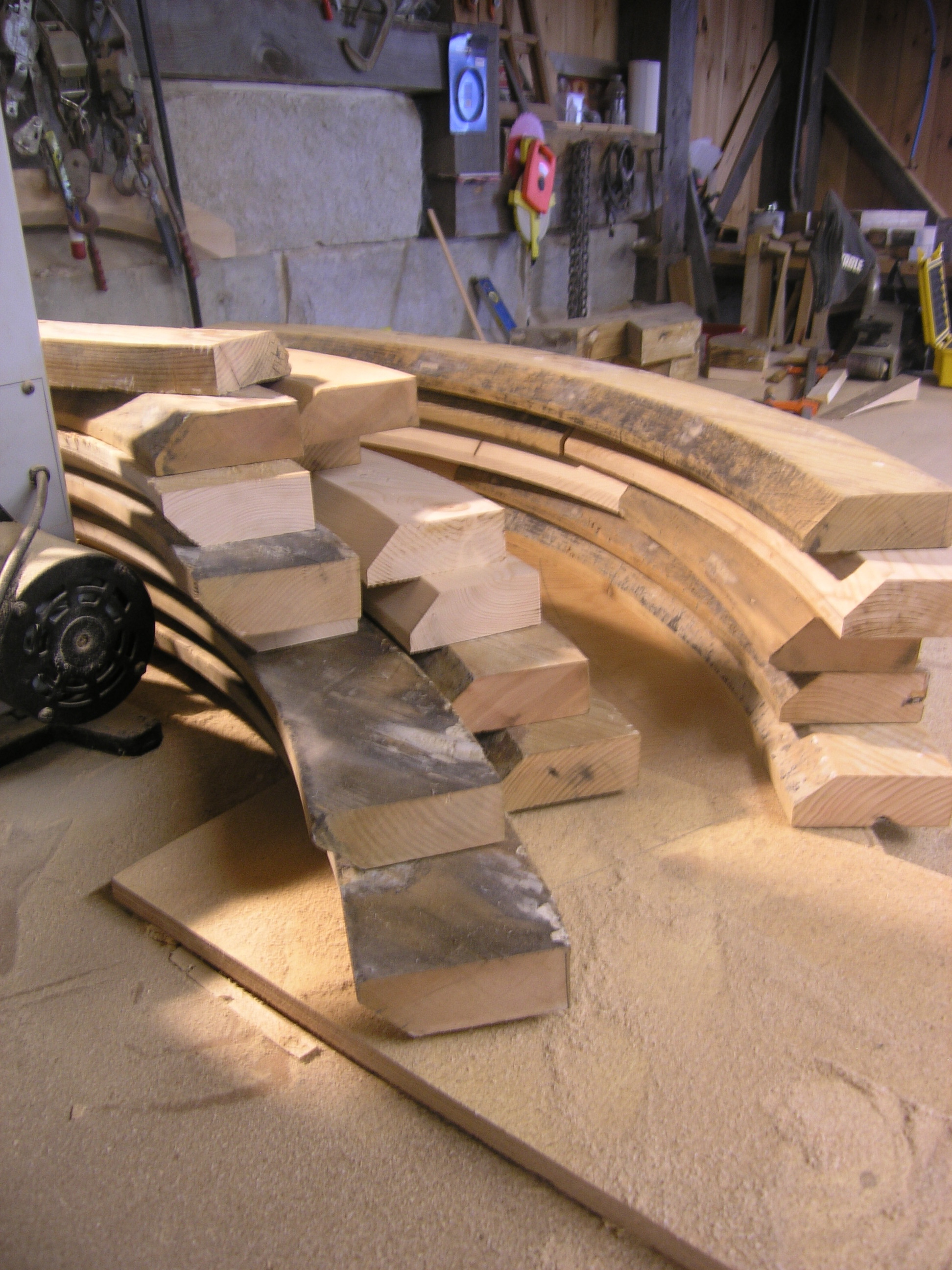 These past few weeks, with the inclement weather, the York Congregational trim has kept us busy in the shop. Using a steam box, we carefully scraped the lead paint from the trim pieces, made dutchman repairs, and filled nail holes with West System epoxy. We were able to repair 90% of the scroll-shaped trim that surrounds the clock-faces, and about half of the curved pieces that create the outline of the clock-faces. The pieces at the bottom of the curve collect the most rainwater, and all needed to be replaced. In order to cut the bevel on the concave edge of the new circular trim, Keith tilted the table of the bandsaw, and made a circular track for the trim to ride in.